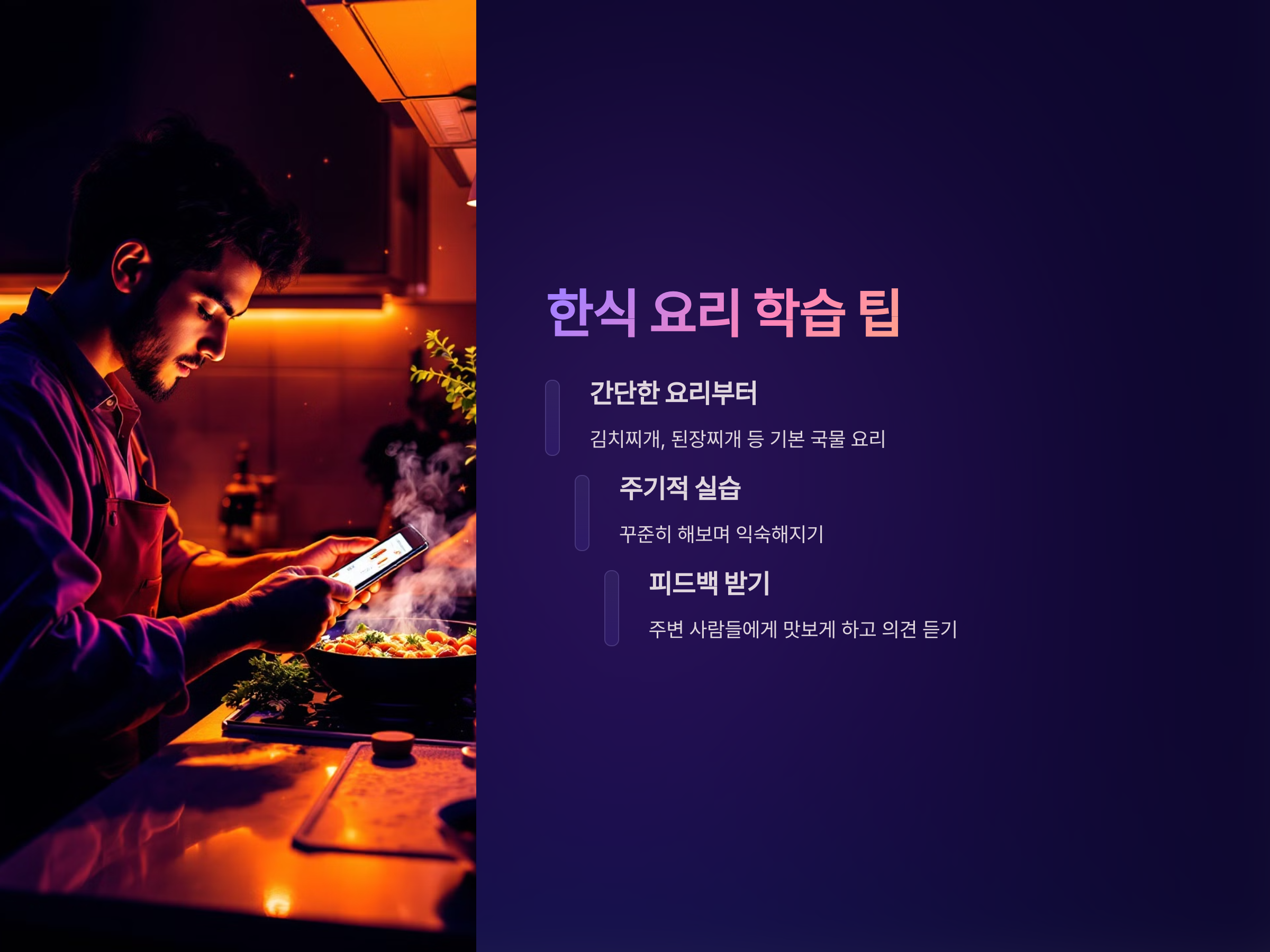 전통 한식 요리를 쉽게 배우는 방법은 무엇보다 꾸준한 실습과 정확한 기본 재료의 이해입니다. 한식을 배우는 과정은 시간이 걸릴 수 있지만, 작은 성공을 하나씩 이루며 자신감을 얻는 것이 중요합니다. 요리책, 유튜브, 온라인 강의 등 다양한 자료를 통해 쉽게 배울 수 있는 만큼, 시작해보세요.