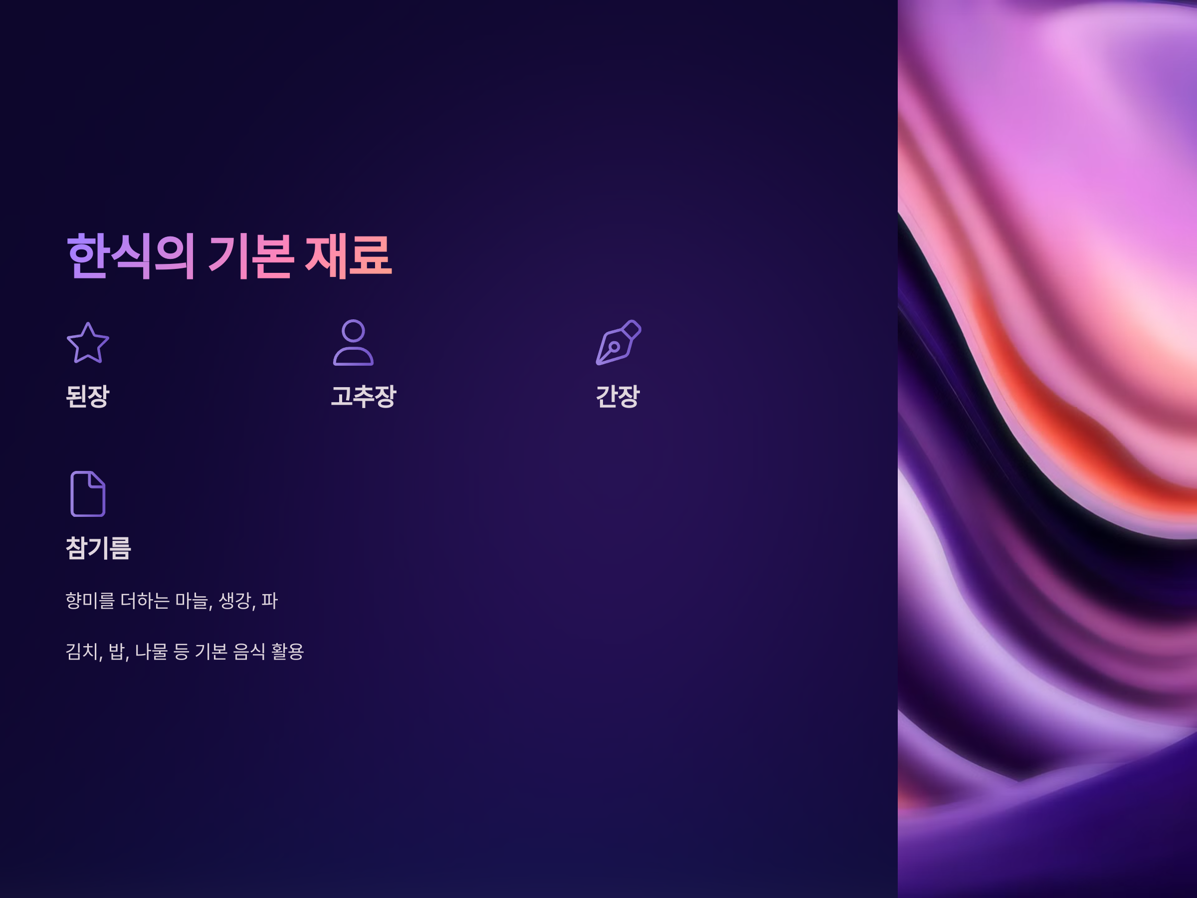 이 외에도 한식에 자주 등장하는 마늘, 생강, 파 등은 향미를 더해주는 중요한 재료입니다. 또한 김치, 밥, 나물 등의 기본적인 음식들을 어떻게 활용할지 아는 것이 중요합니다. 한식을 제대로 배울 때, 각 재료의 특성을 이해하고, 재료의 맛을 어떻게 끌어낼 수 있는지 아는 것이 핵심입니다.