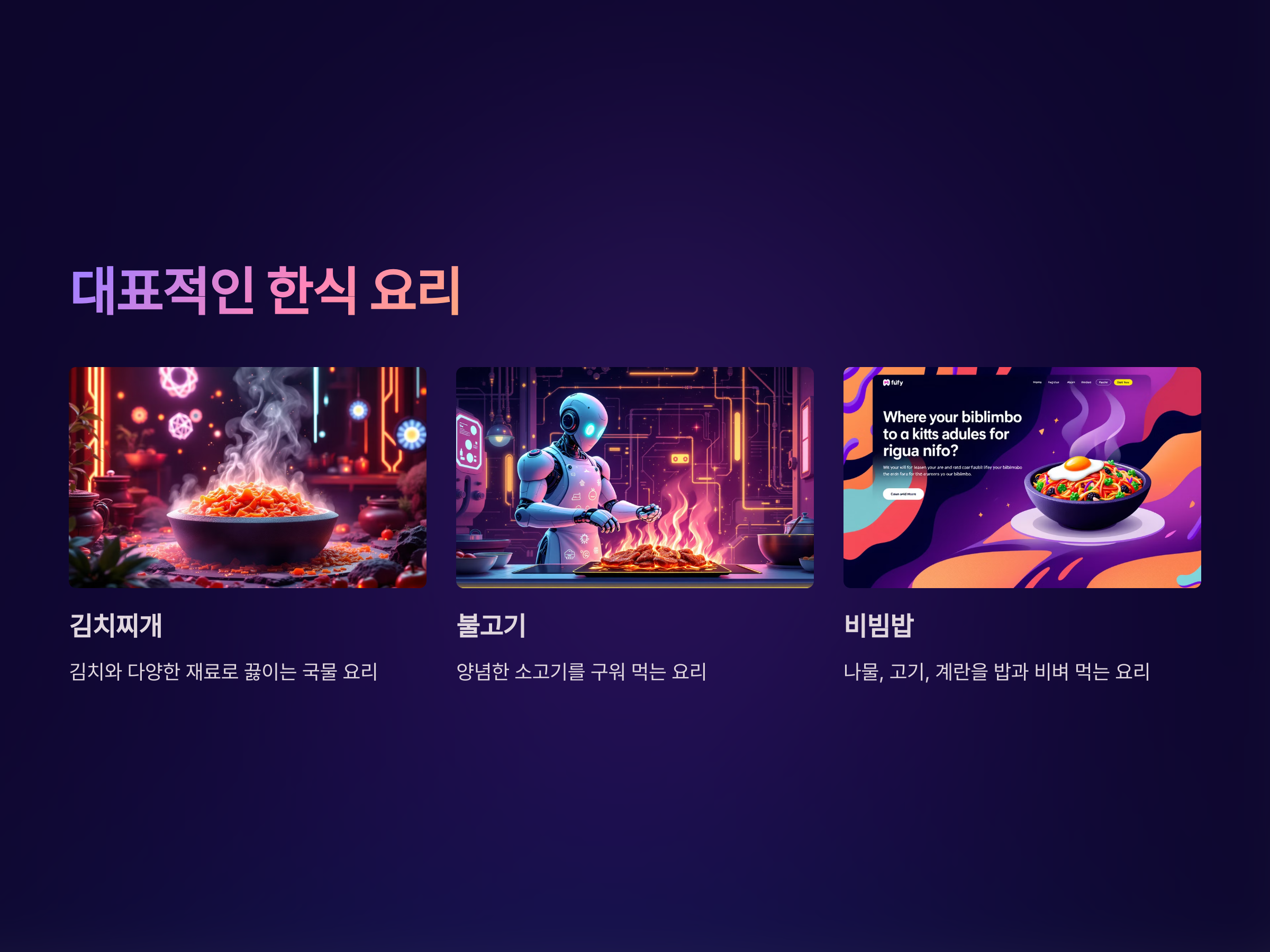 이러한 대표적인 요리들을 배우면, 한식 요리의 기본을 잘 익힐 수 있으며, 그 후에는 조금 더 복잡한 요리로 넘어갈 수 있습니다.