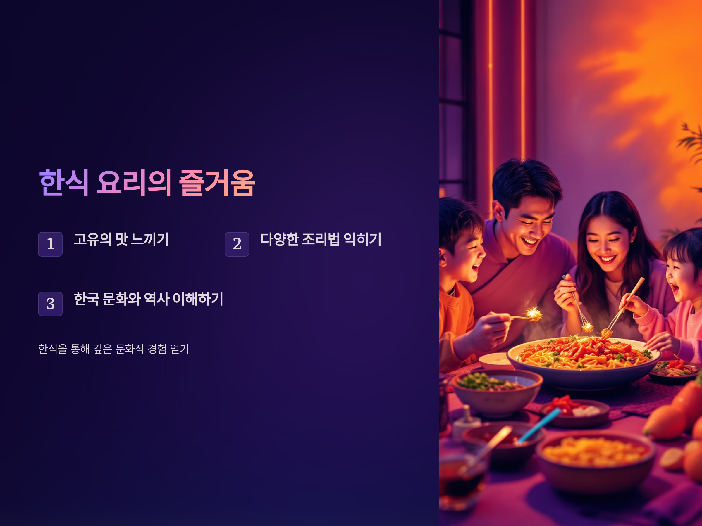 한식을 배우면서 그 고유의 맛을 느끼고, 다양한 조리법을 익히는 즐거움을 느껴보세요. 요리를 통해 한국의 깊은 문화와 역사까지 이해할 수 있는 기회가 될 것입니다.