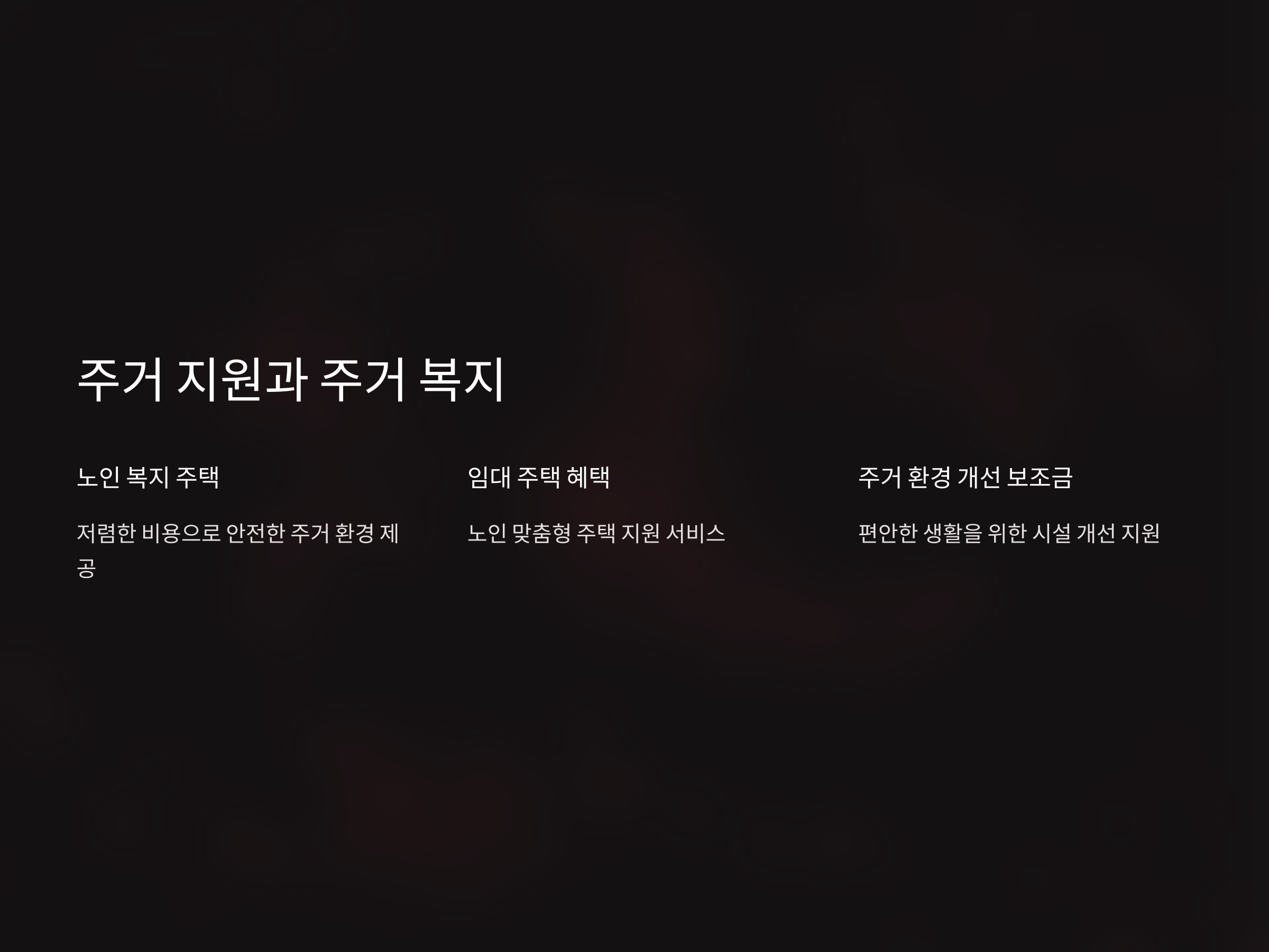노인들에게 안전하고 편리한 주거 환경을 제공하기 위해 다양한 정부 지원이 마련되어 있습니다. 예를 들어, 노인 복지 주택, 임대 주택 등 저렴한 비용으로 거주할 수 있는 혜택을 제공하고 있습니다. 또한, 노인들이 보다 편안하게 살 수 있도록 주거 환경을 개선할 수 있는 보조금도 지급됩니다.