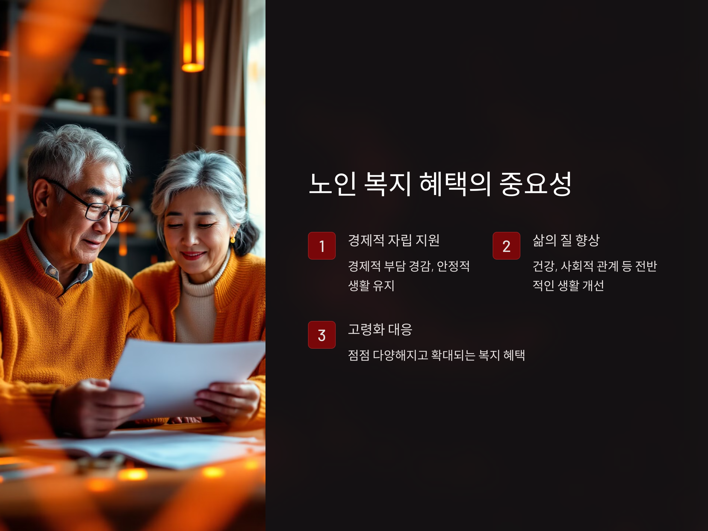 노인 복지 혜택은 단순히 경제적인 지원을 넘어서, 노인들의 건강, 삶의 질, 사회적 관계 등 전반적인 생활을 향상시키는 데 중요한 역할을 합니다. 특히 고령화 사회로 접어들면서, 정부는 노인들이 경제적으로 자립할 수 있도록 다양한 정책을 펼치고 있습니다. 이에 따라 노인들에게 제공되는 복지 혜택도 점점 더 다양해지고 있으며, 그 범위가 확대되고 있습니다.