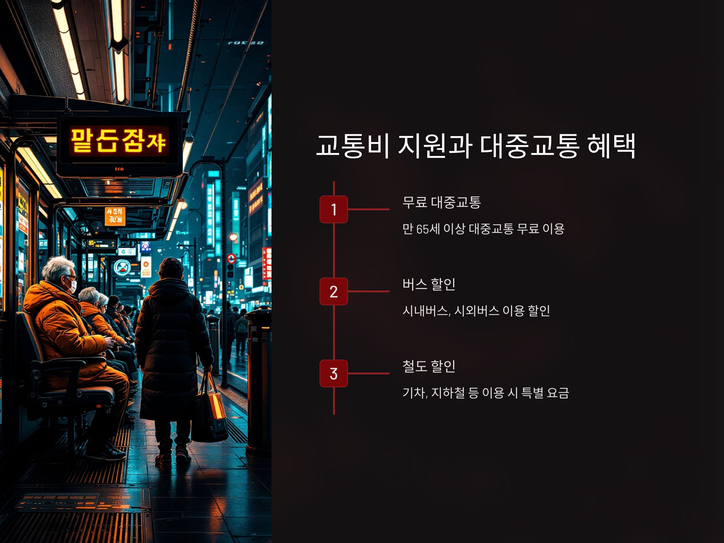교통비 부담은 노인들에게 큰 경제적 부담이 될 수 있습니다. 이를 해결하기 위해 정부는 대중교통 이용 시 다양한 혜택을 제공합니다. 예를 들어, 만 65세 이상의 노인들은 대중교통을 무료로 이용할 수 있는 혜택을 누릴 수 있습니다. 이 외에도 버스, 지하철, 기차 등에서 노인 할인 혜택을 받을 수 있습니다.