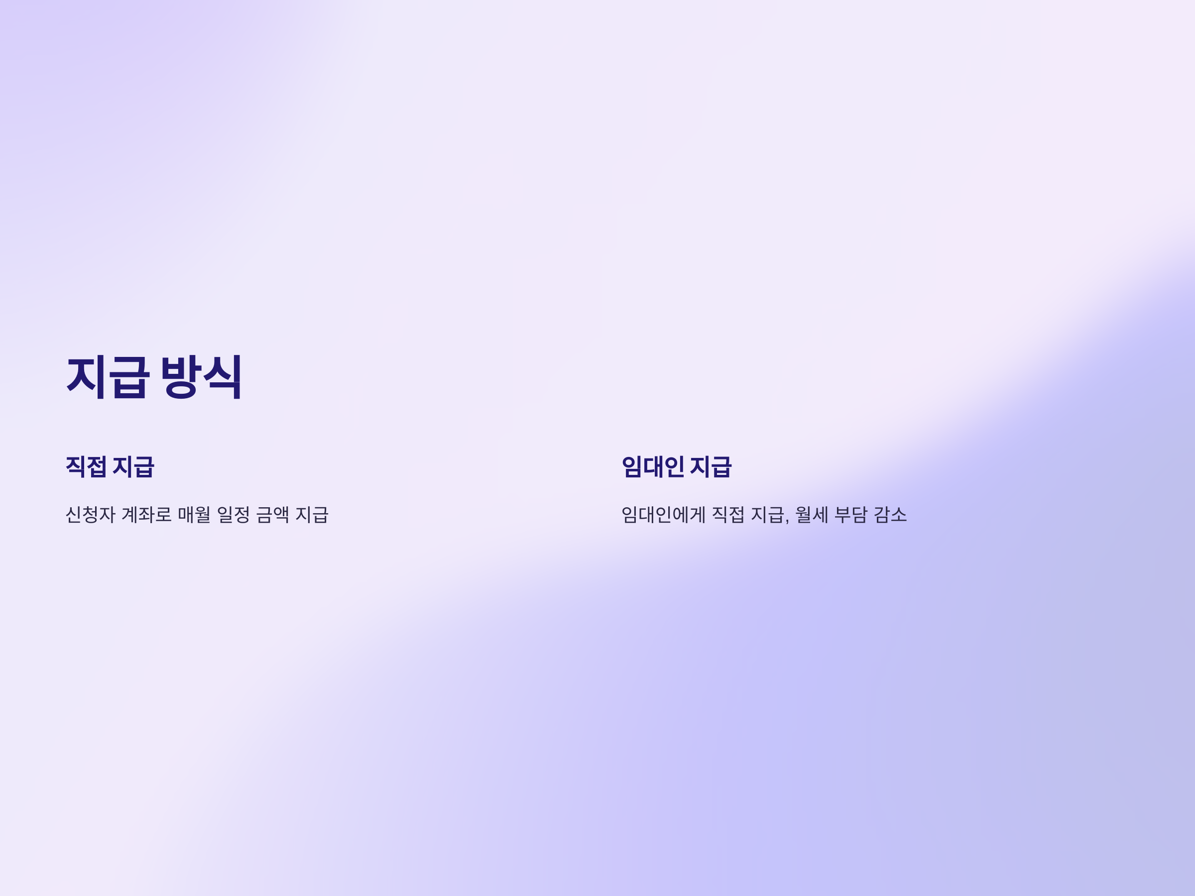 다른 경우에는 월세 보조금을 직접 임대인에게 지급하는 방식이 있습니다. 이 경우, 지원금을 임대인이 수령하며, 보조금이 적용된 금액만큼 신청자는 월세를 덜 부담하게 됩니다.