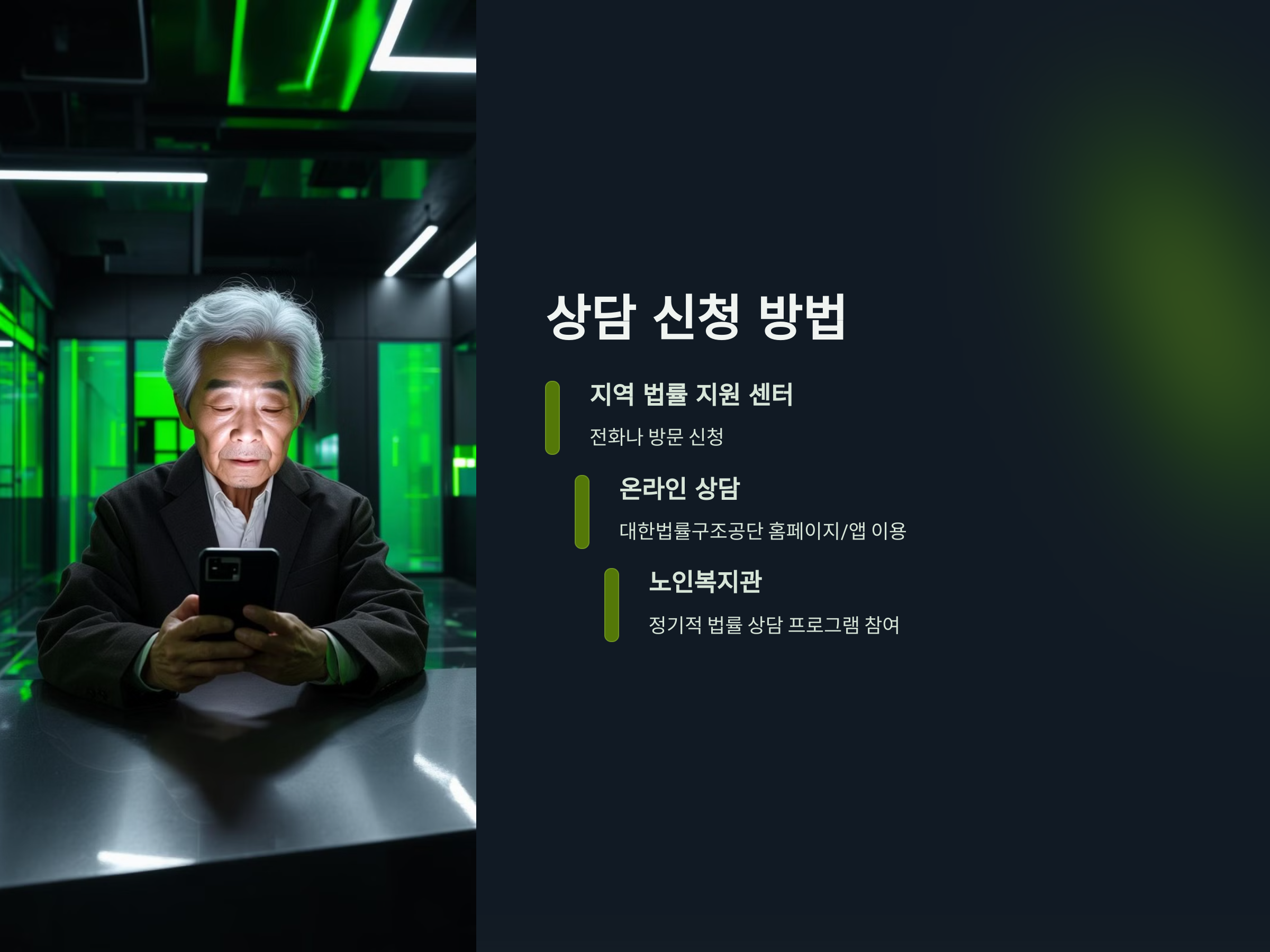요즘에는 온라인으로도 법률 상담을 신청할 수 있는 방법이 많습니다. 예를 들어, 대한법률구조공단의 홈페이지나 전용 모바일 앱을 통해 온라인 상담 신청을 할 수 있습니다. 이 경우, 집에서 편리하게 상담을 받을 수 있기 때문에 많은 노인들이 선호하는 방법이기도 합니다.