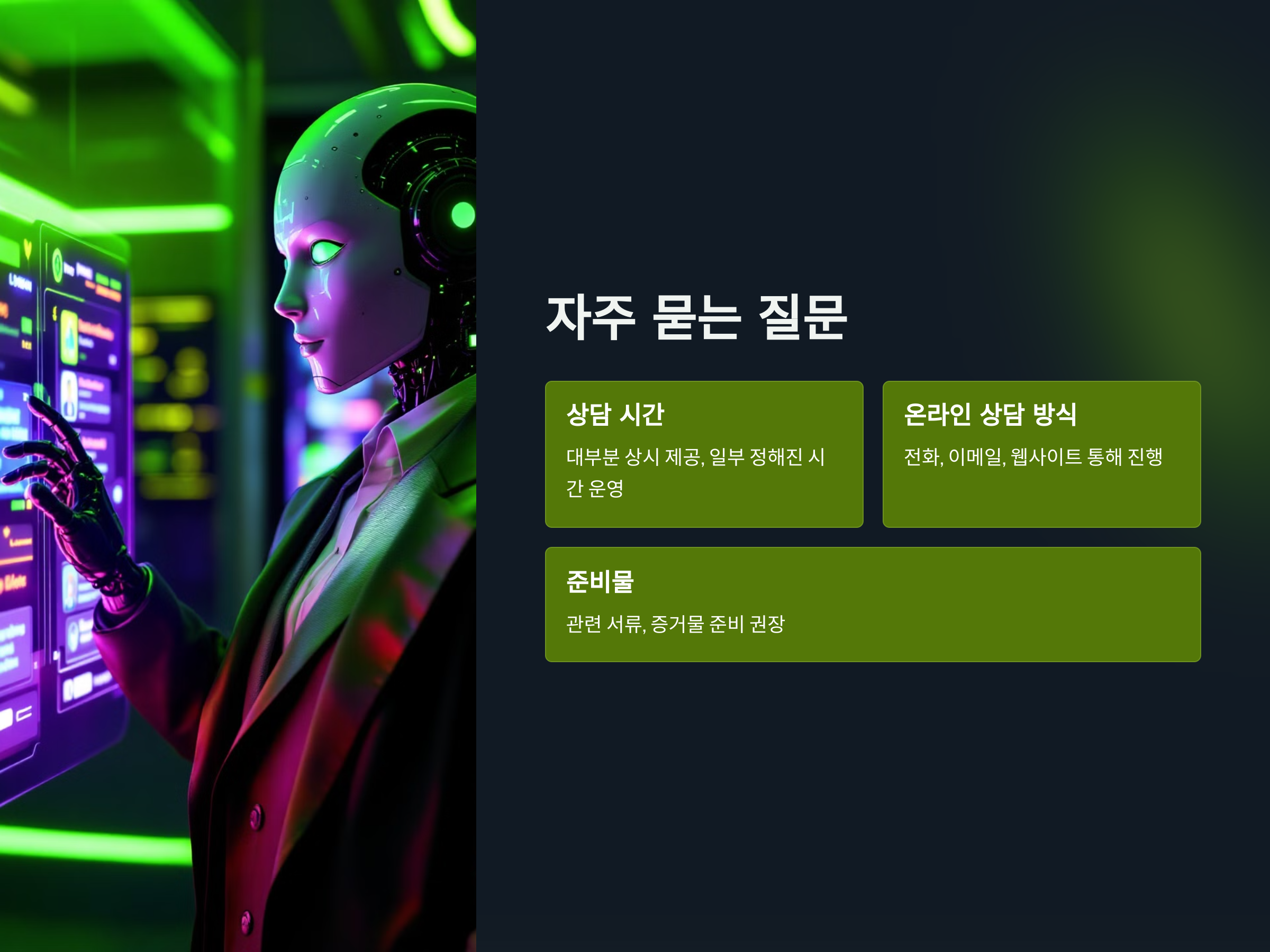 온라인 상담은 전화나 이메일, 웹사이트를 통해 이루어집니다. 상담자는 사전에 제출된 정보를 바탕으로 온라인 상에서 답변을 제공하며, 경우에 따라 전화나 영상 통화를 통한 실시간 상담이 이루어지기도 합니다.