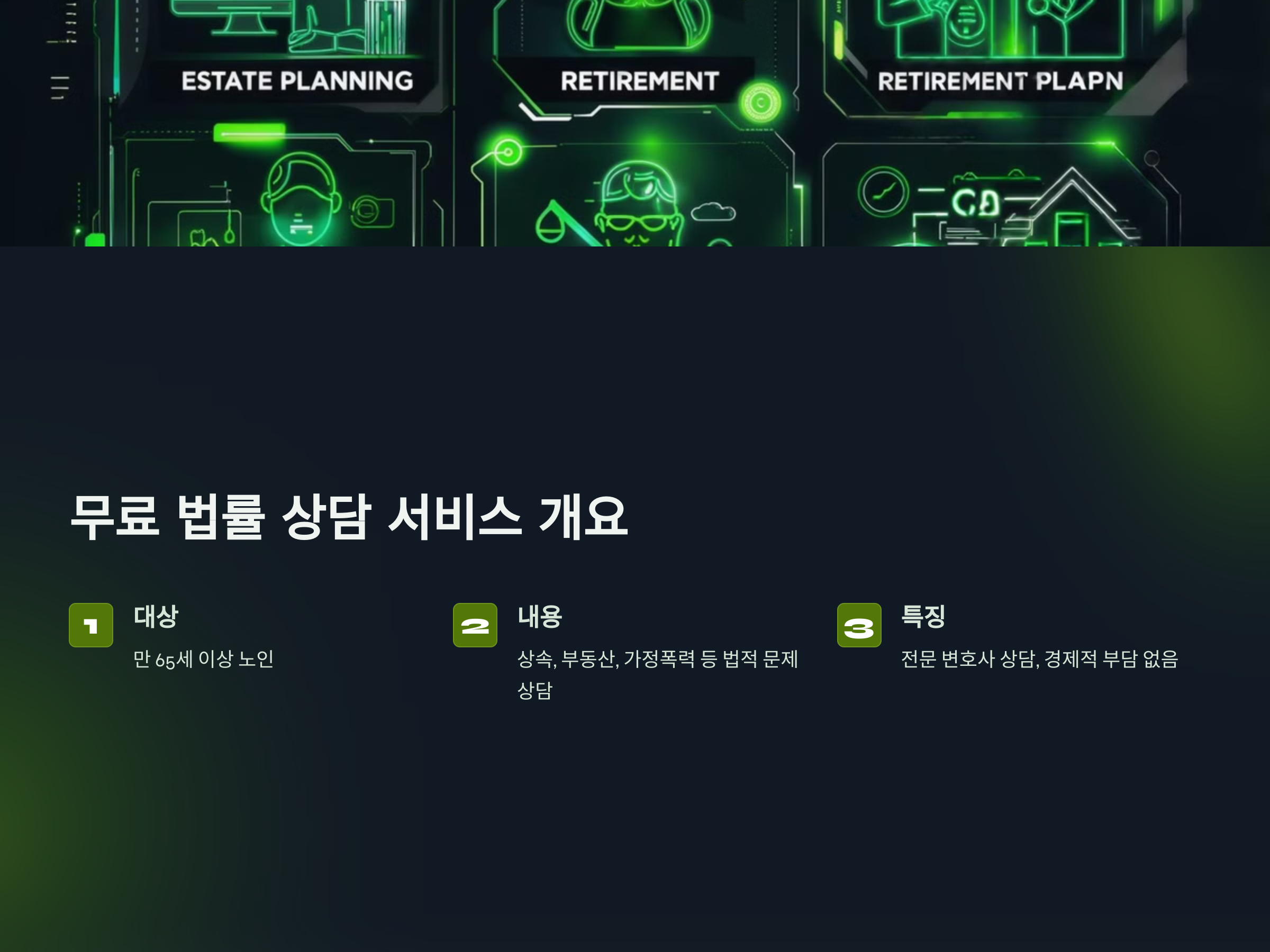 정부가 제공하는 무료 법률 상담 서비스는, 주로 노인들이 법적인 문제를 겪을 때 경제적인 부담 없이 도움을 받을 수 있는 프로그램입니다. 예를 들어, 상속 문제, 부동산 계약, 가정폭력 문제, 연금 및 보험 관련 문제 등 다양한 법적 상황에 대한 상담을 무료로 제공받을 수 있습니다. 이 서비스는 법률 전문가들이 직접 상담을 해주기 때문에, 전문적인 조언을 받을 수 있어 매우 유용합니다.