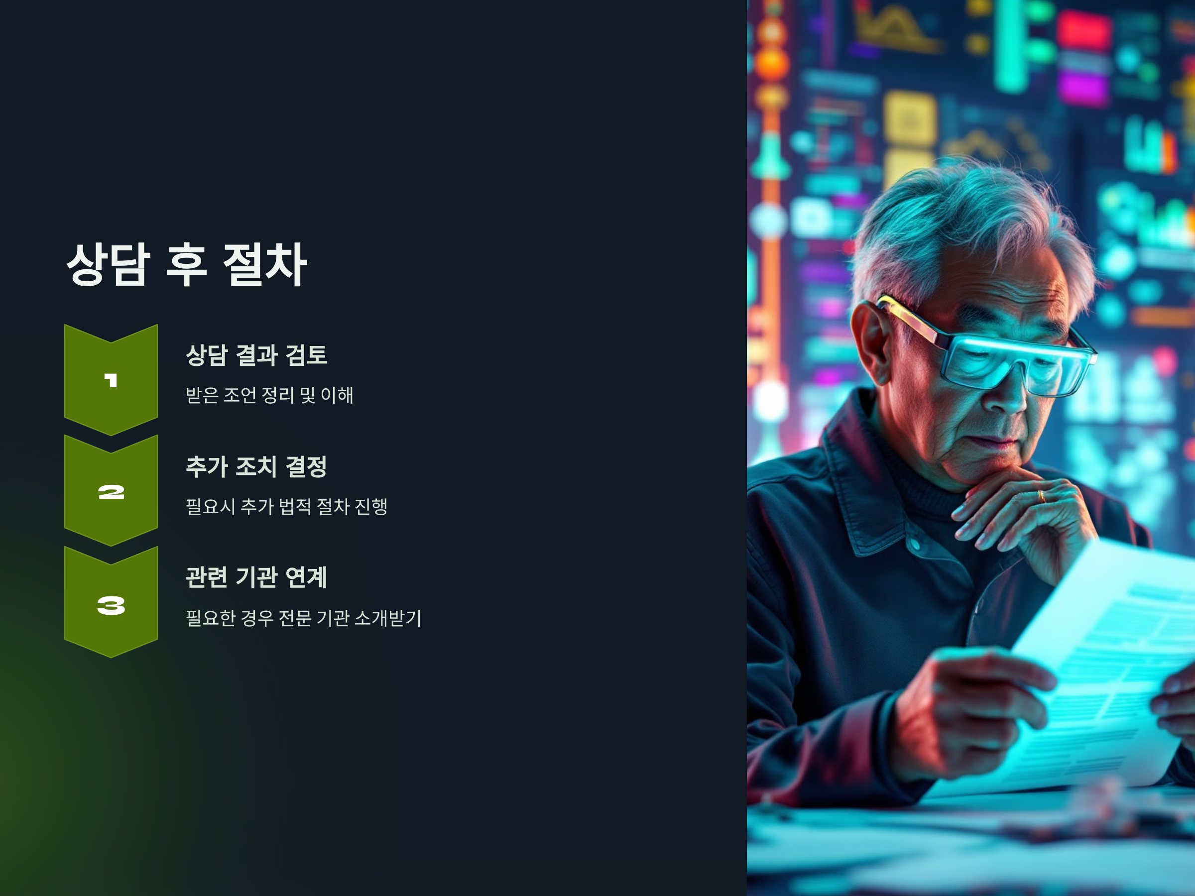 법률 상담을 받은 후, 필요한 경우 추가적인 절차나 조치를 취해야 할 수 있습니다. 예를 들어, 상속 문제에 대해 상담을 받았다면, 이후 유언장 작성이나 상속세 신고와 같은 후속 절차가 필요할 수 있습니다. 이를 위해 법률 상담 후에는 후속 절차에 대해 명확하게 안내받는 것이 중요합니다.