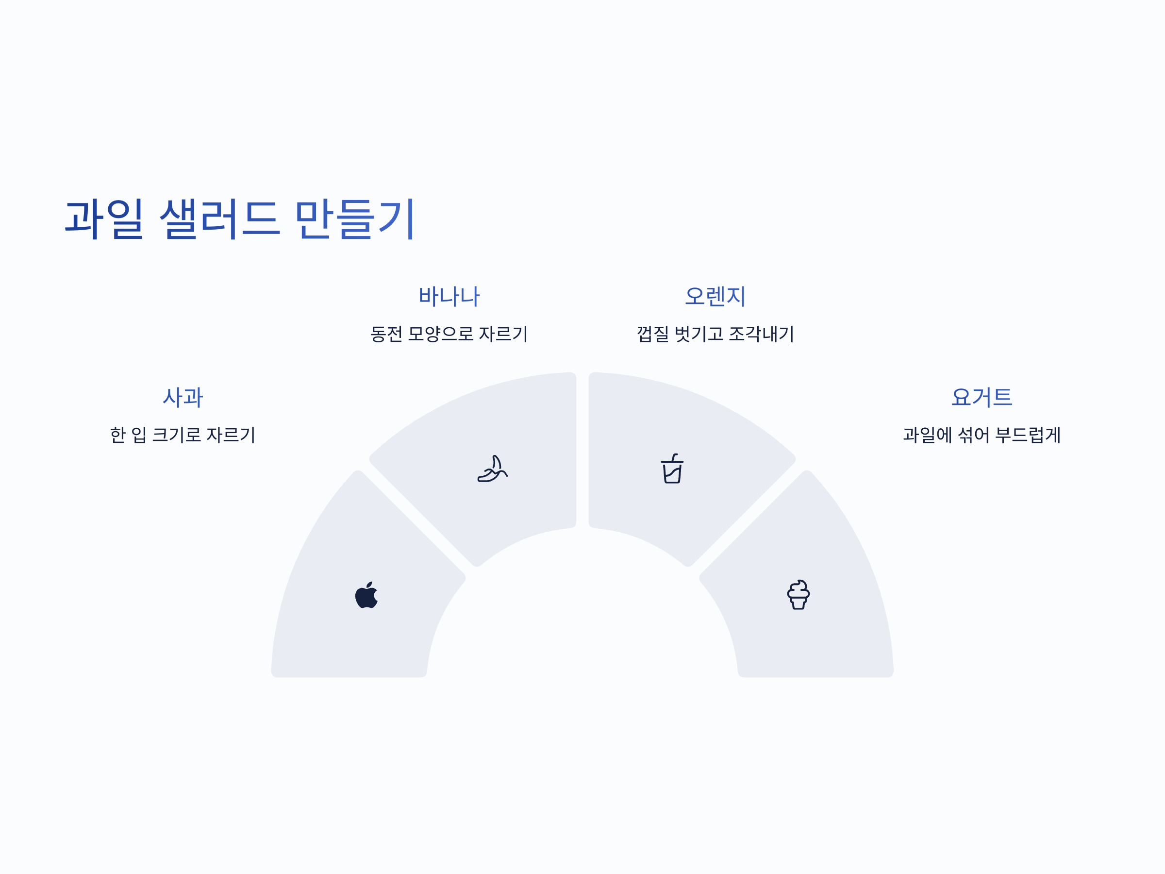 - 모든 과일을 깨끗이 씻고 껍질을 벗긴 후 한 입 크기로 잘라줍니다.