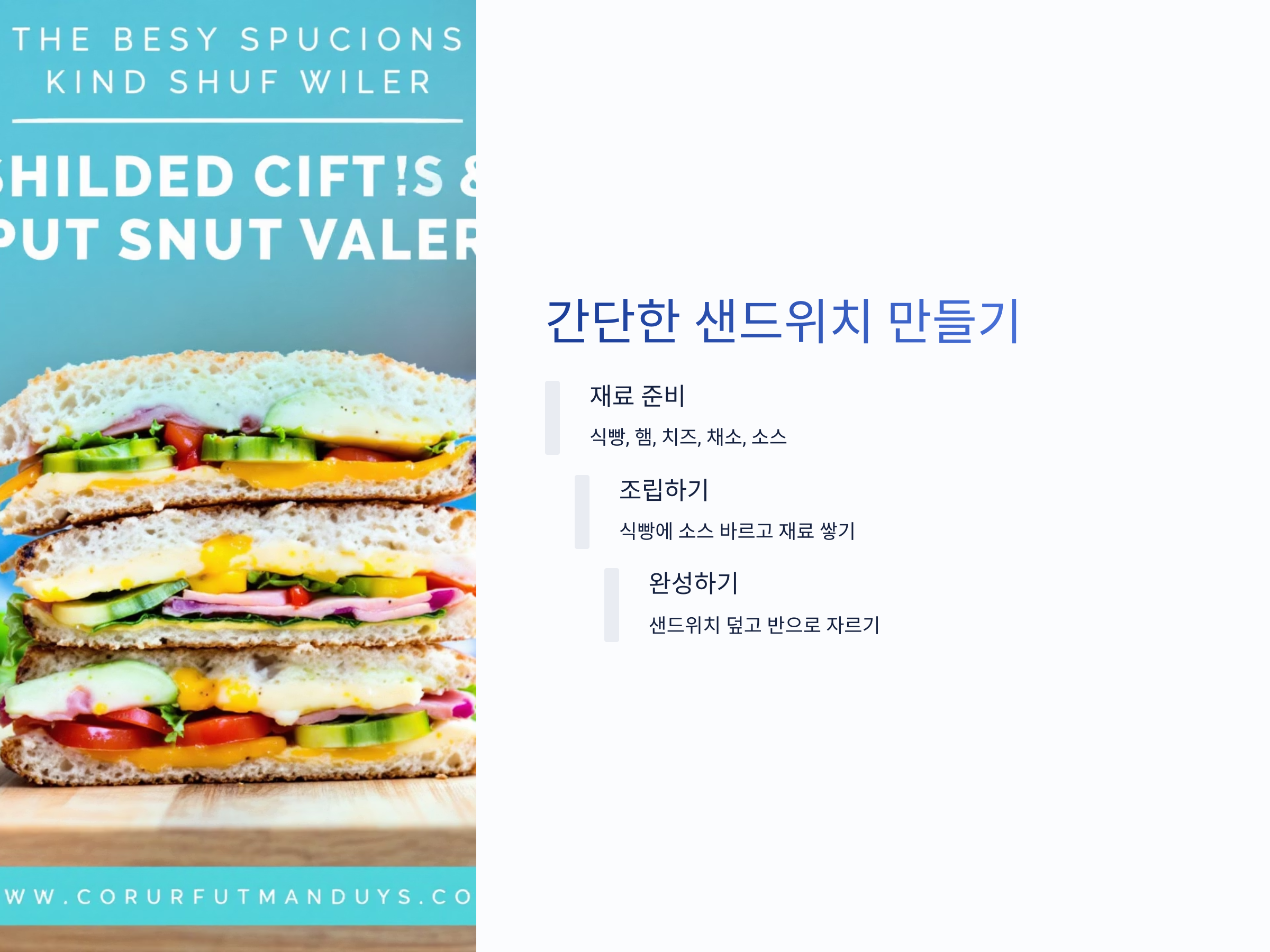 샌드위치는 아이들이 좋아하는 간식이자 간단한 식사로, 조부모와 손주가 함께 만들기 좋은 레시피입니다. 여러 가지 재료를 넣어 취향에 맞게 샌드위치를 만들 수 있으며, 손주들이 좋아하는 재료를 선택하도록 도와주는 것도 즐거운 경험이 됩니다.