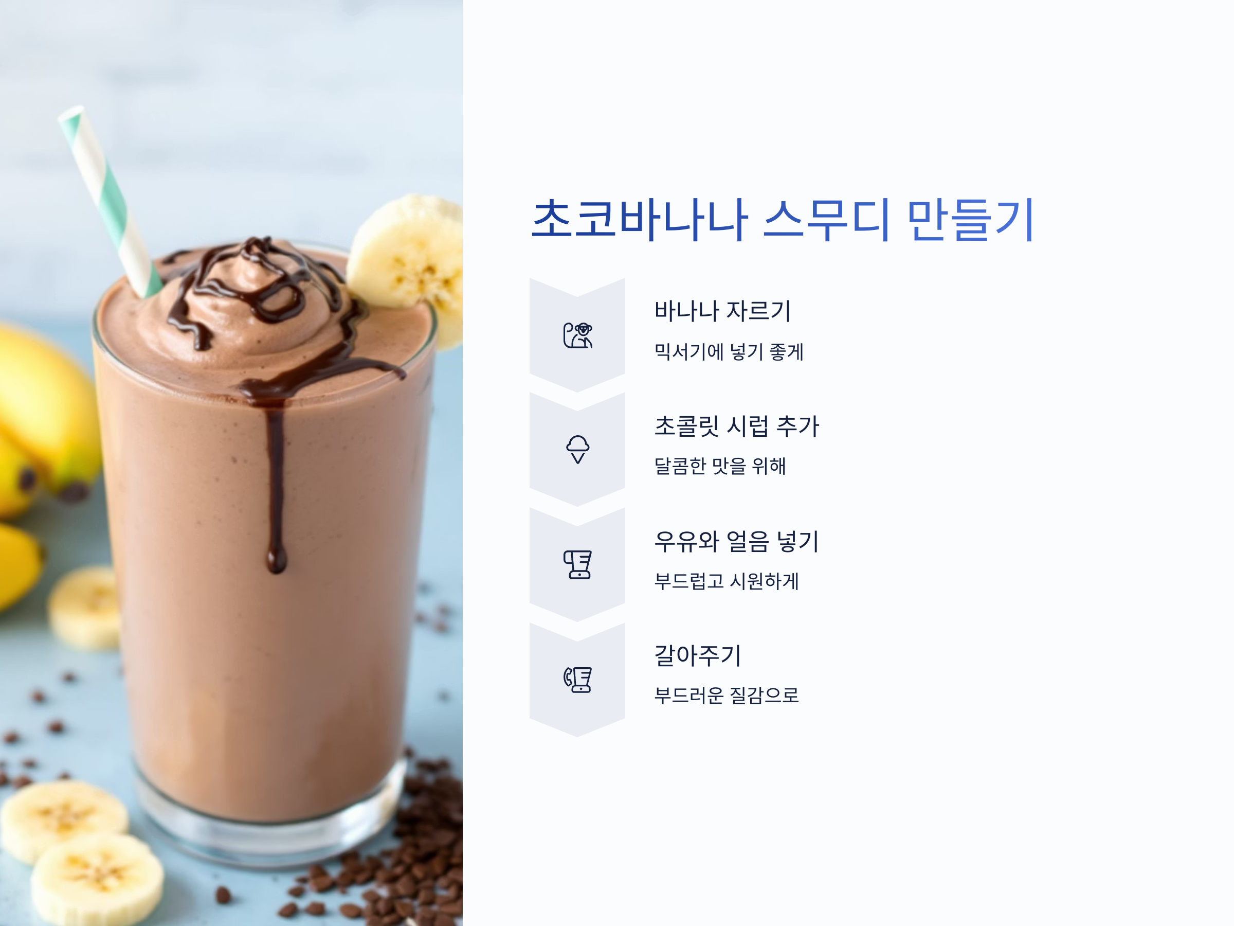 초코바나나 스무디는 달콤하고 시원한 음료로, 손주들이 쉽게 만들 수 있는 레시피입니다. 바나나와 초콜릿 맛이 잘 어우러져 아이들에게 인기가 많으며, 간단한 재료로 빠르게 만들 수 있어 손주들이 흥미롭게 참여할 수 있습니다.