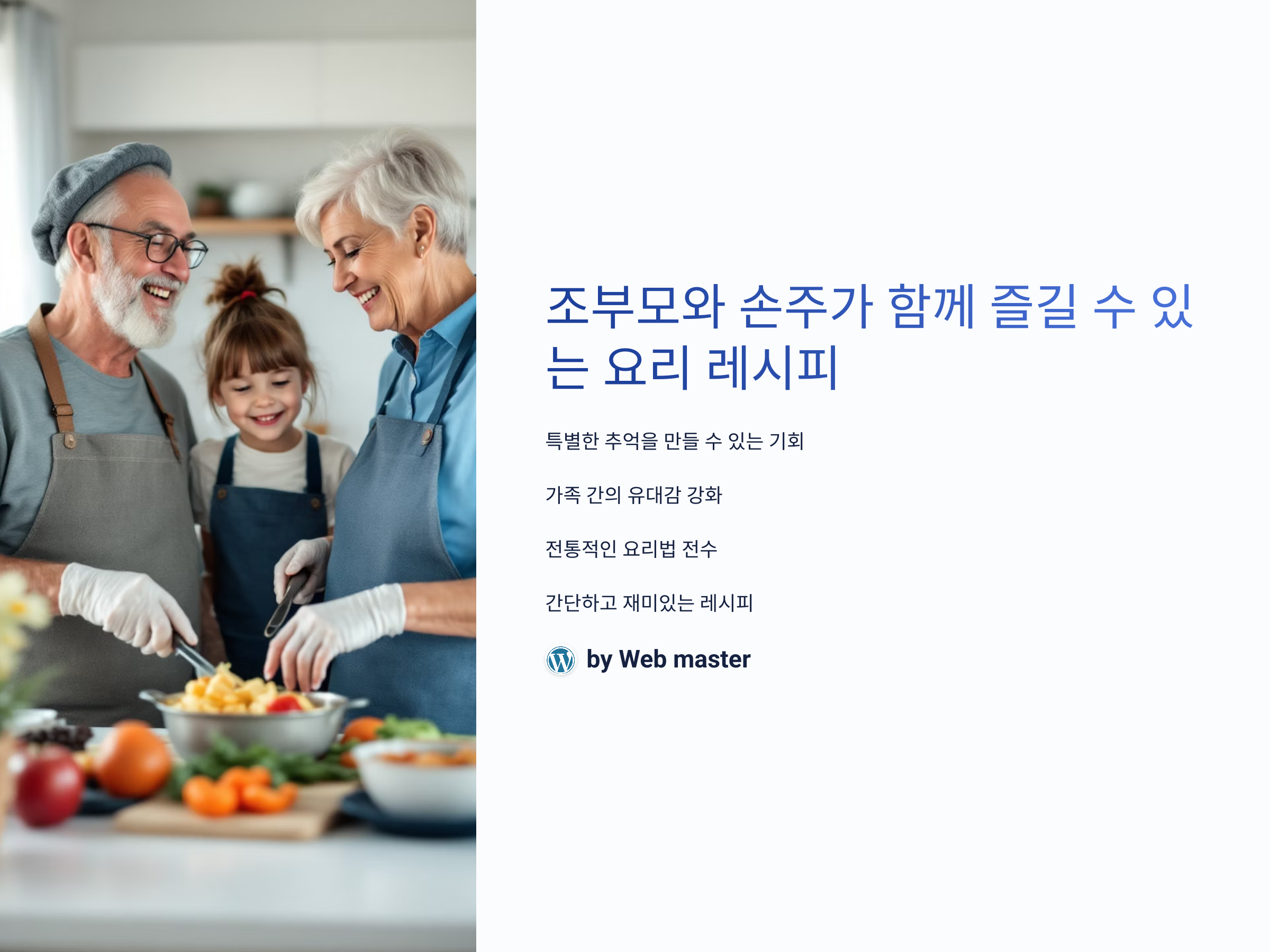 조부모와 손주가 함께하는 요리 시간은 소중한 추억을 만들어가는 과정입니다. 아이들에게 요리의 기본적인 기술을 가르쳐주고, 함께 만들며 즐거운 시간을 보내는 것만으로도 가족 간의 관계가 깊어집니다. 위에서 소개한 레시피들은 간단하고 맛있으면서도 아이들이 손쉽게 참여할 수 있도록 구성되었습니다. 앞으로도 다양한 요리로 손주들과 함께 즐거운 시간을 보내세요!