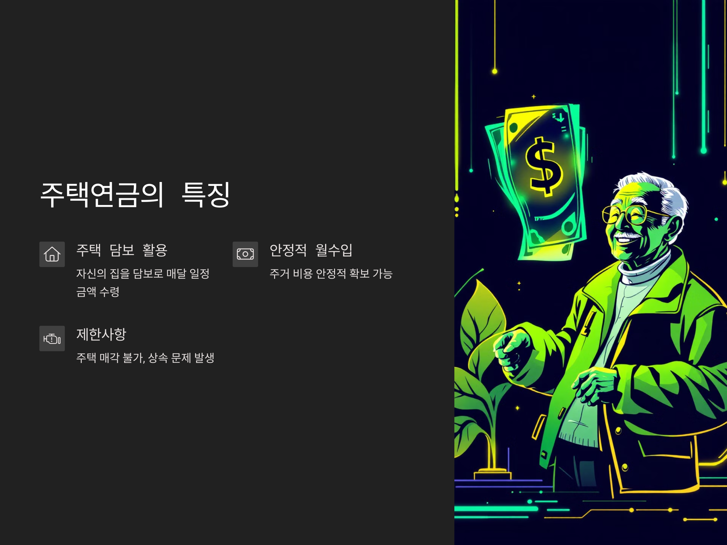 주택연금의 가장 큰 특징은 고령자가 자신의 집을 담보로 하여 주택가격의 일부를 매달 받는 시스템이라는 점입니다. 주택연금의 주요 장점은 지속적인 월급처럼 주거 비용을 안정적으로 확보할 수 있다는 점입니다. 또한, 주택을 팔지 않고도 매달 지급받는 금액을 통해 생활비를 충당할 수 있어 노후 생활에 큰 도움이 됩니다. 이러한 점에서 주택연금은 집을 팔지 않으면서도 현금을 확보할 수 있는 장점이 있습니다.