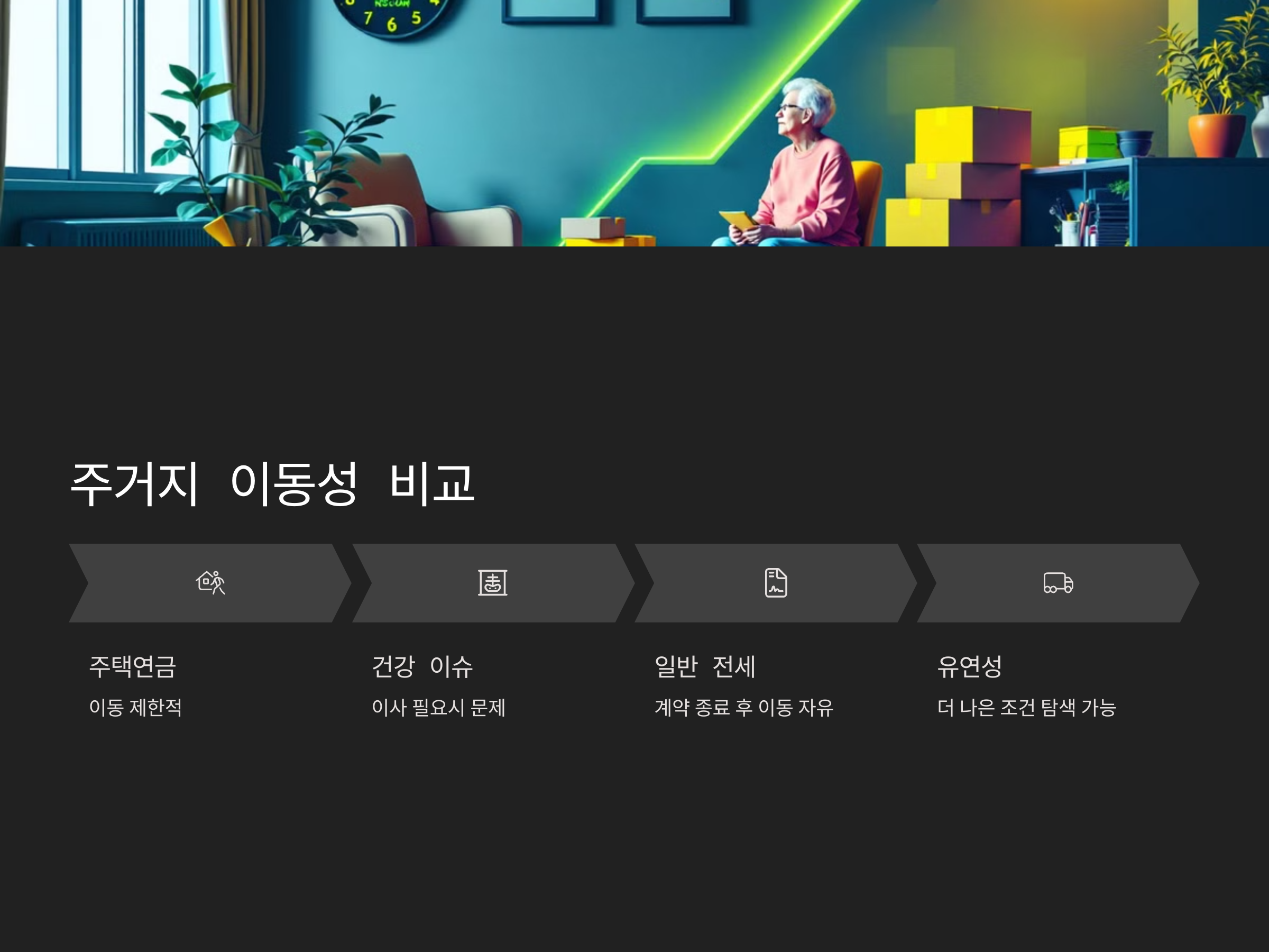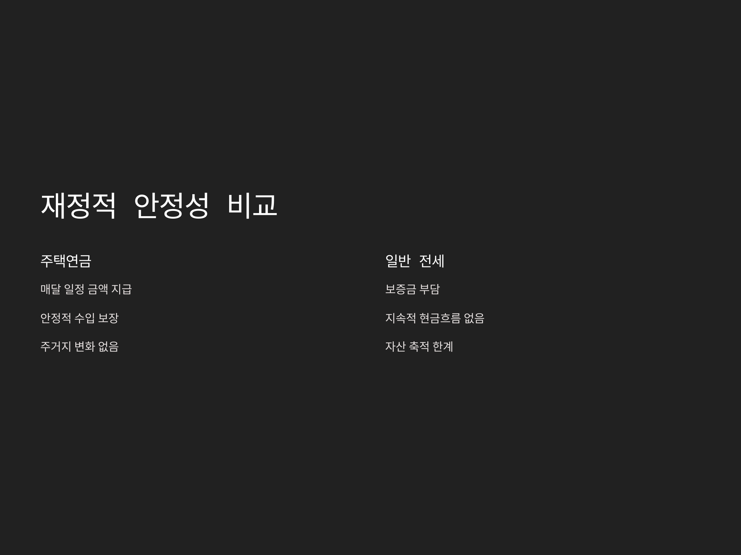 반면, 일반 전세는 보증금이 큰 부담이 될 수 있으며, 장기적으로 봤을 때 자산 축적에는 한계가 있습니다. 전세금을 돌려받을 수 있지만, 매월 일정한 수입을 확보할 수 있는 주택연금과 달리 전세는 그 자체로 지속적인 현금을 제공하지 않기 때문에, 재정적으로 안정된 노후를 보장하기 어려울 수 있습니다.