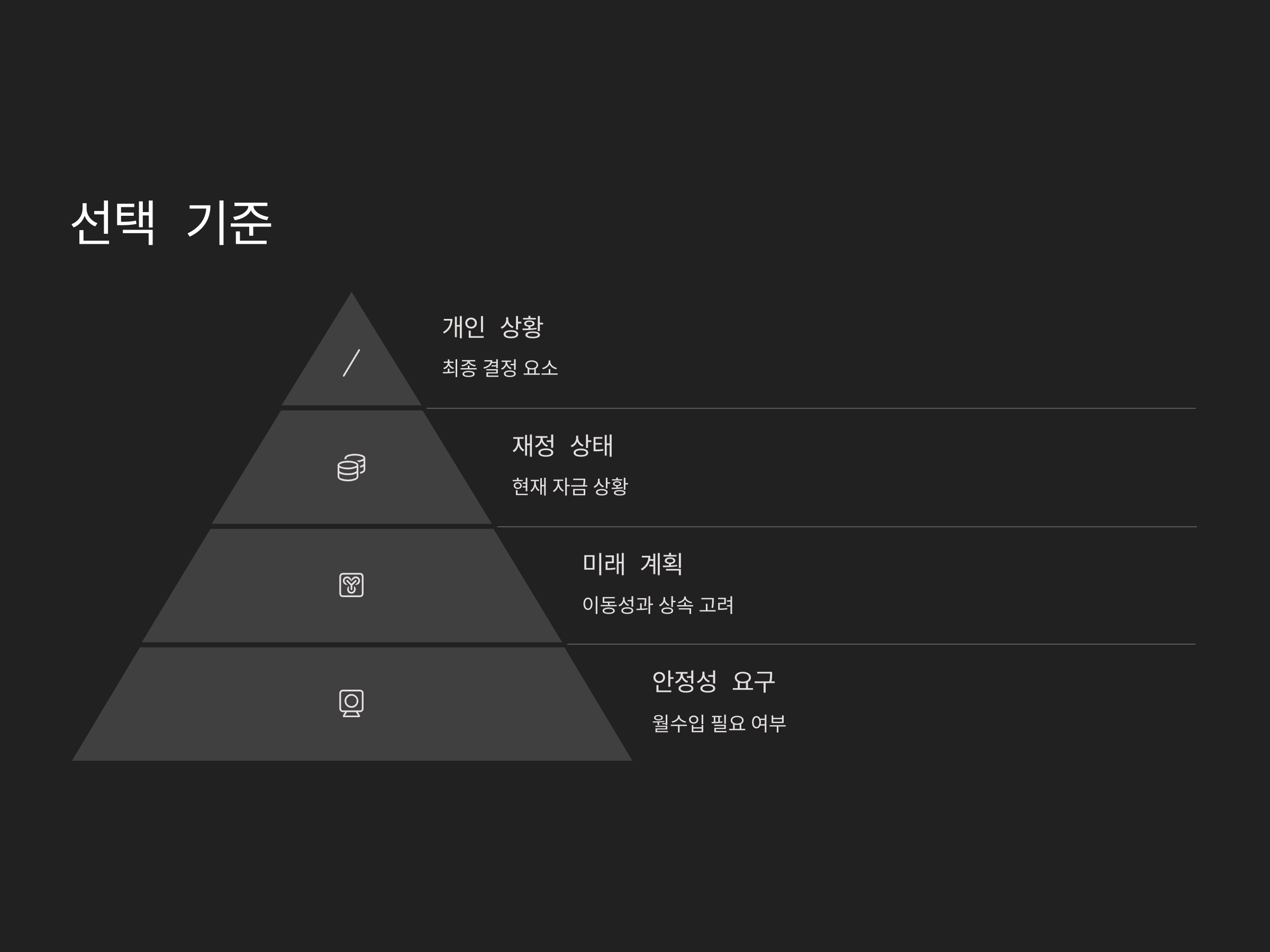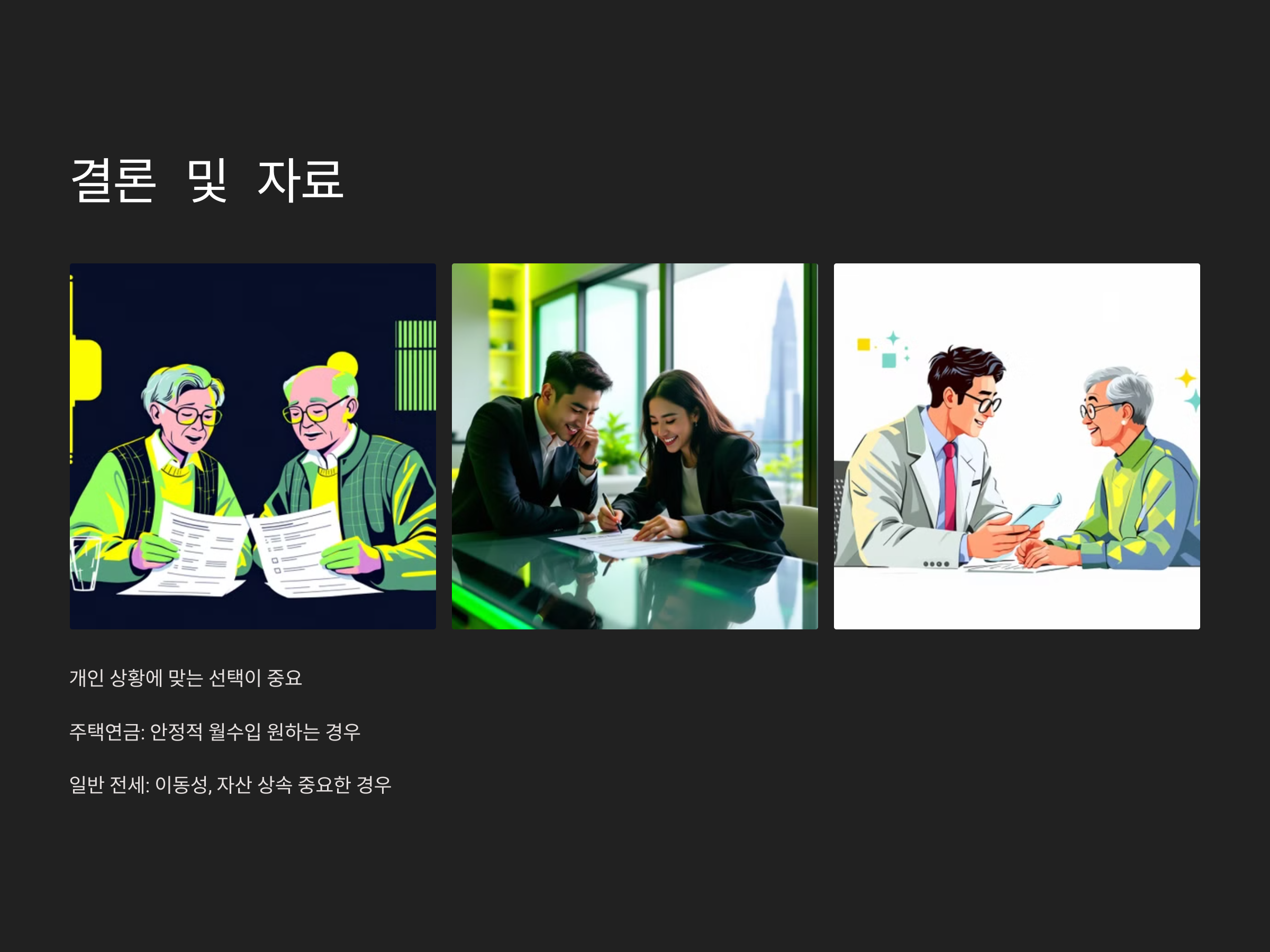 따라서, 주택연금과 전세를 선택할 때는 자신의 재정 상태와 생활 패턴을 고려하는 것이 중요합니다. 안정적인 월수입을 원하고 주거지 변경에 큰 부담이 없다면 주택연금이 유리할 수 있습니다. 반면, 주거지 이동성이나 자산 상속을 고려한다면 일반 전세가 더 적합할 수 있습니다. 결국, 개인의 상황에 맞는 선택이 가장 중요합니다.