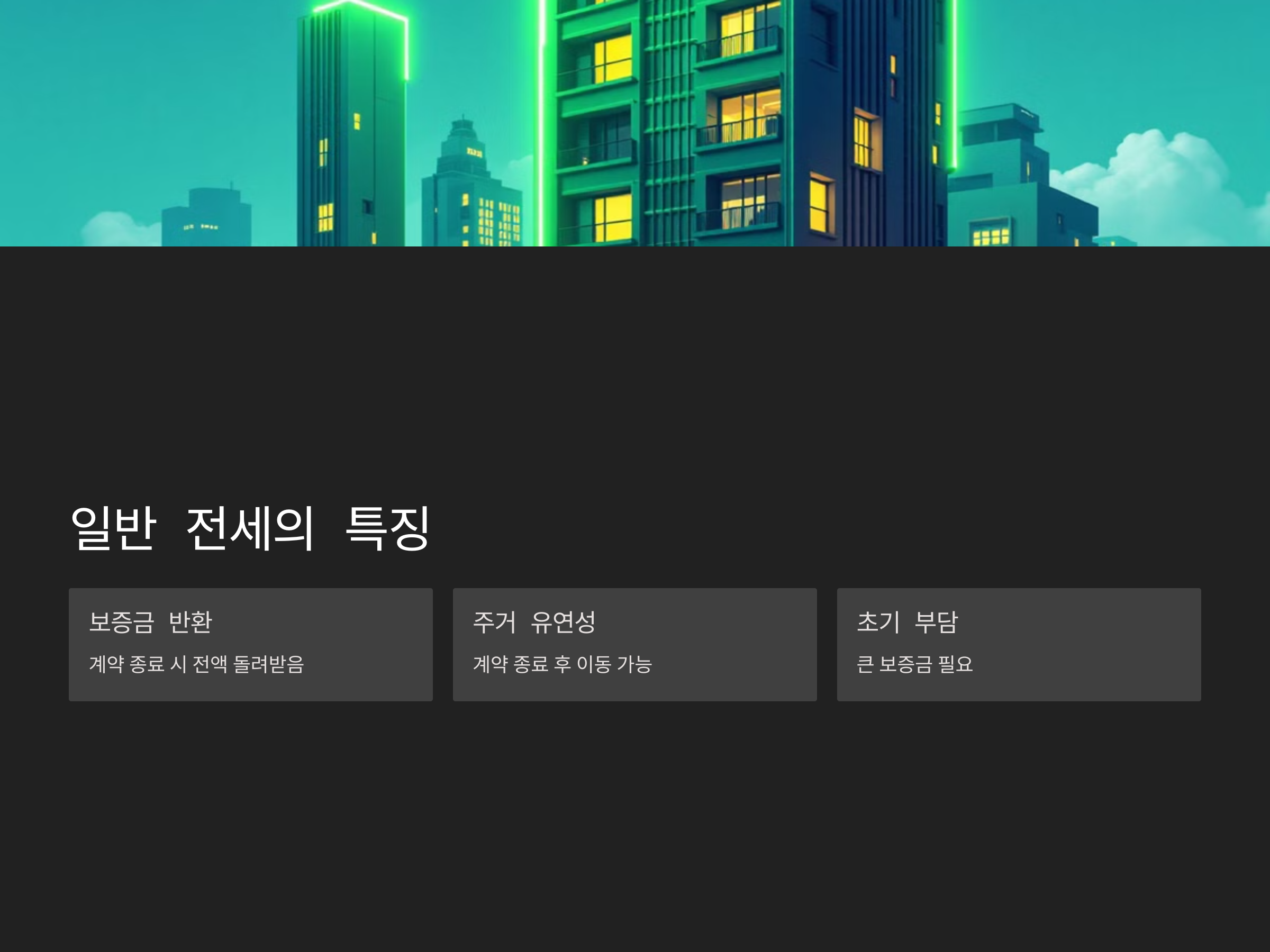 일반 전세는 주택을 임대하는 방식으로, 계약 기간 동안 보증금을 집주인에게 맡기고 거주할 수 있는 형태입니다. 전세의 가장 큰 장점은 계약이 종료되면 보증금을 전액 돌려받을 수 있다는 점입니다. 또한, 전세금이 일정 기간 동안 보존되므로, 전세금을 투자할 수 있는 다른 방법을 찾을 수도 있습니다. 이는 주택을 매각하지 않고도 주거지를 변경할 수 있는 유연성을 제공합니다.