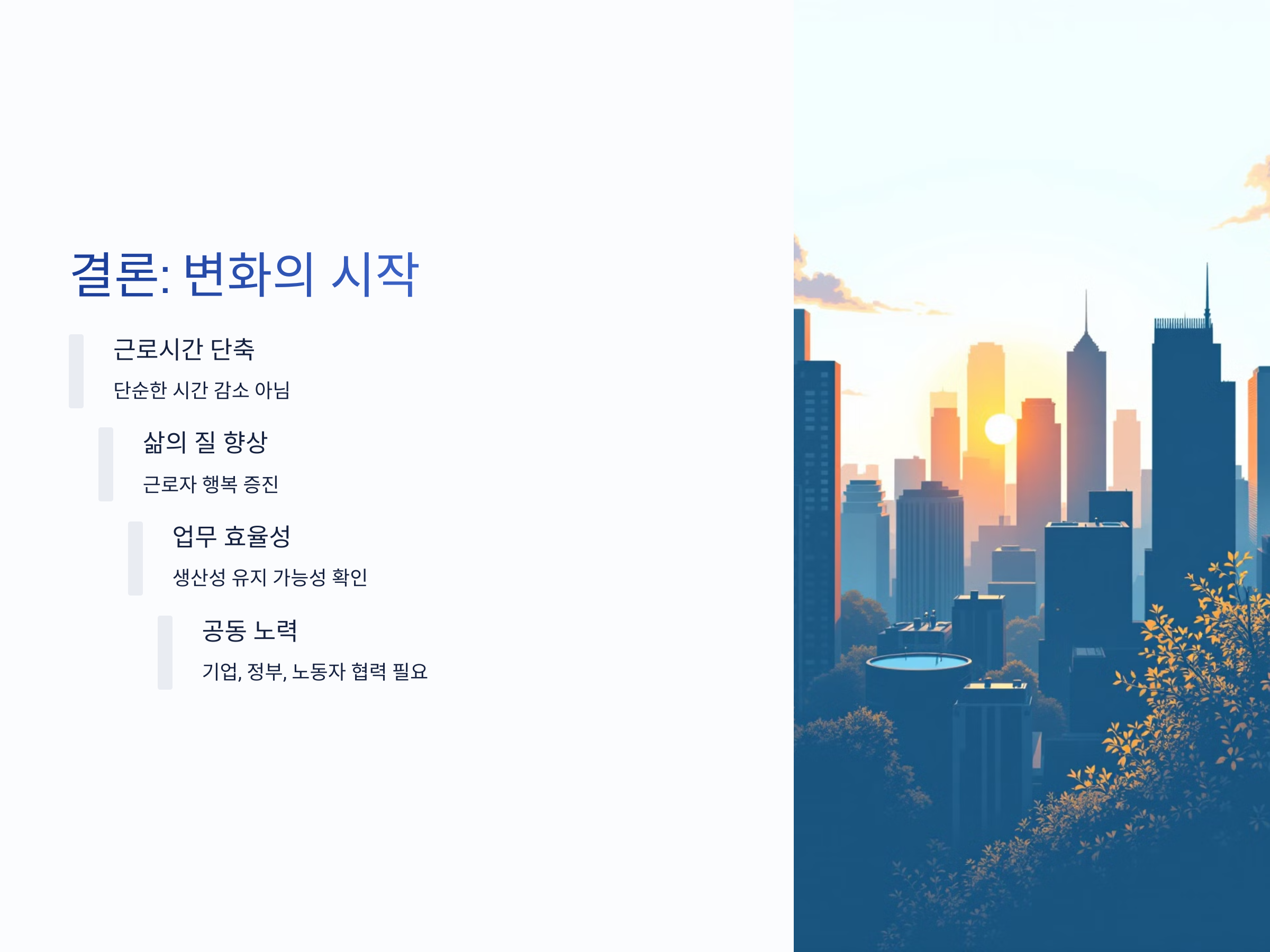 주 4일 근무제의 도입은 단순히 근로 시간을 단축시키는 문제가 아닙니다. 이는 근로자의 삶의 질을 높이고, 업무 효율성을 증대시킬 수 있는 중요한 변화입니다. 물론, 이를 도입하는 과정에서 발생할 수 있는 여러 우려와 문제점들을 해결해야 합니다. 하지만, 여러 성공적인 사례들을 바탕으로 주 4일 근무제가 긍정적인 영향을 미칠 가능성은 충분히 크다고 할 수 있습니다. 기업과 정부는 이를 현실화할 수 있는 방법을 모색하고, 노동자들은 변화에 적응하며 더 나은 근로 환경을 만들기 위한 노력에 동참해야 할 때입니다.