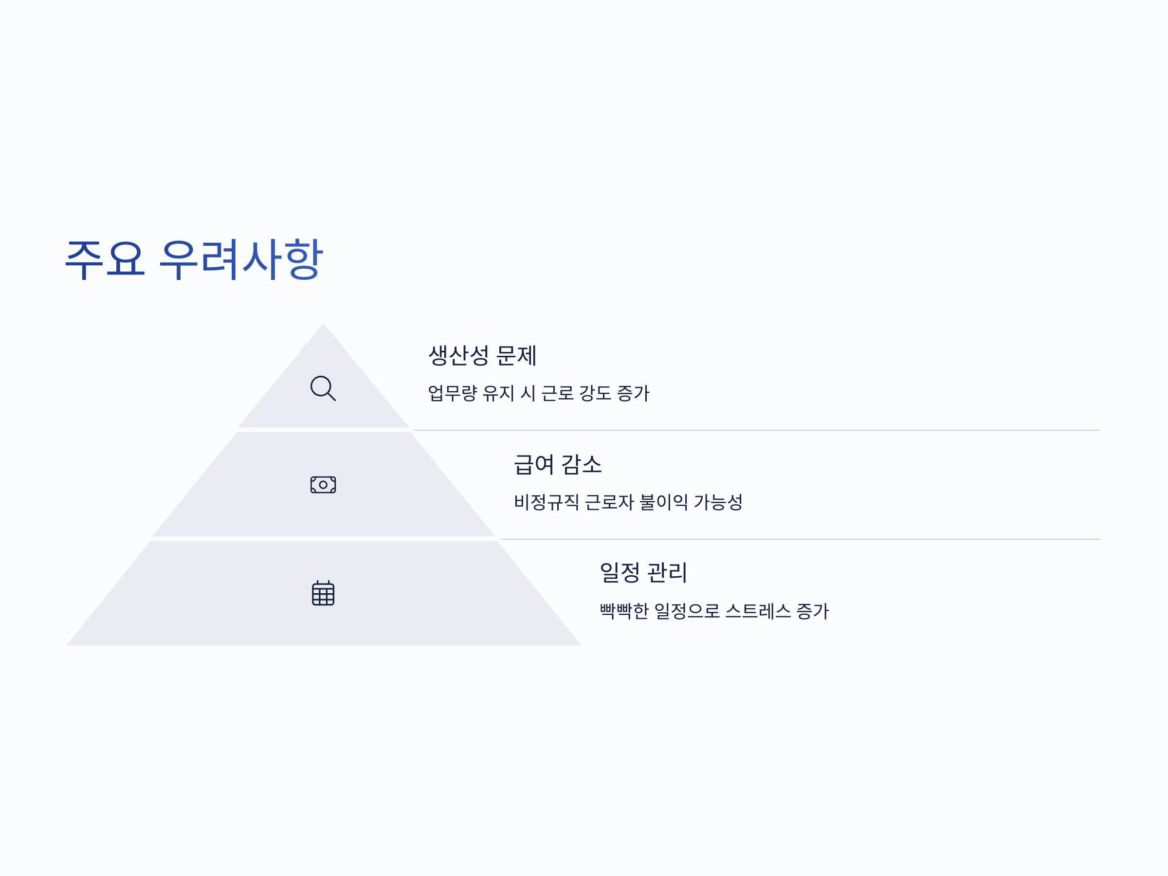 주 4일 근무제 도입에 대한 찬성 의견이 많지만, 이에 대한 우려도 존재합니다. 가장 큰 우려는 바로 생산성 문제입니다. 일부에서는 1일 8시간 근무를 줄이는 대신 같은 양의 업무를 4일에 맞추려면 근로 강도가 증가할 것이라는 점을 지적합니다. 또한, 일정이 빡빡해져 업무에 집중하는 시간보다 휴식 시간이 늘어날 수 있다는 우려도 제기되고 있습니다. 따라서, 주 4일 근무제를 도입할 경우 각 기업의 특성에 맞는 유연한 근무 시스템을 설계하는 것이 매우 중요합니다.