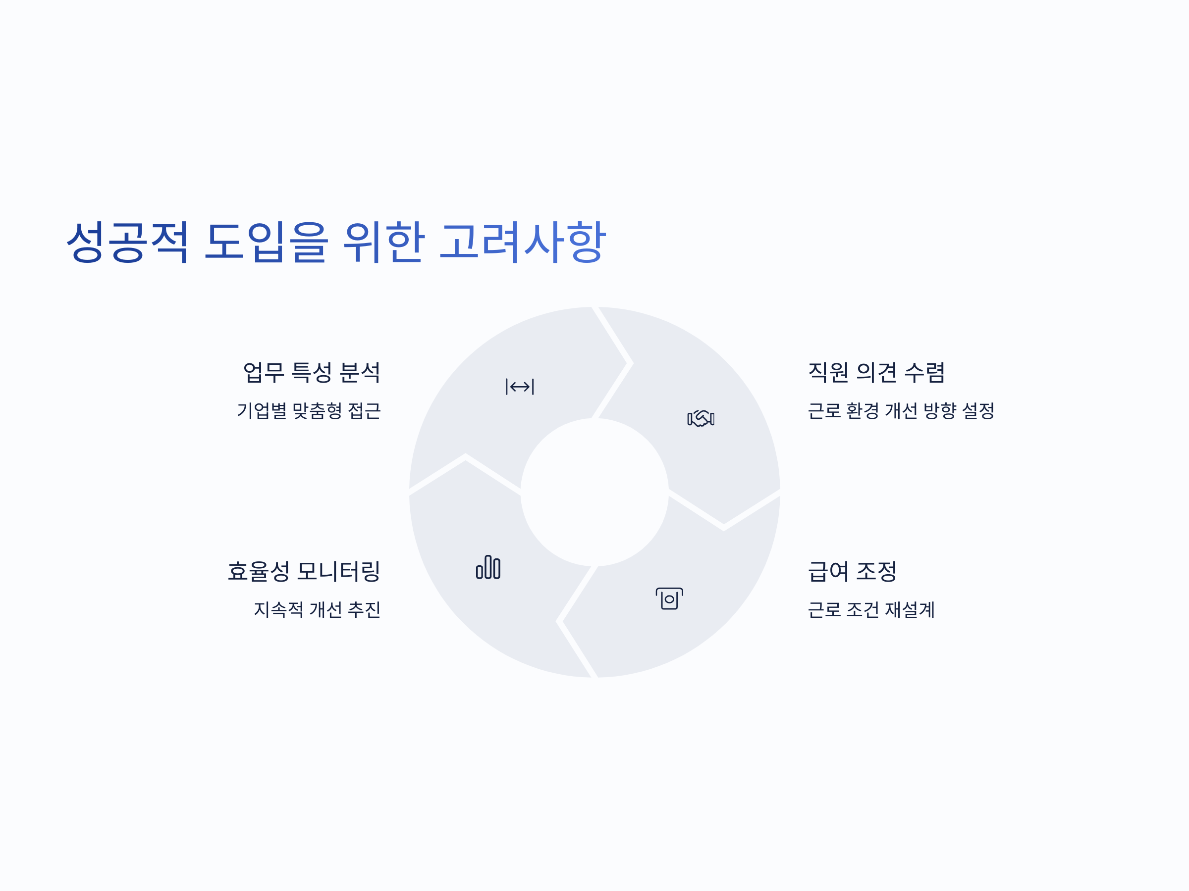 주 4일 근무제를 성공적으로 도입하기 위해서는 몇 가지 중요한 사항들을 고려해야 합니다. 첫째로, 각 기업의 업무 특성을 고려하여 근로시간 단축에 따른 생산성 유지 방안을 모색해야 합니다. 예를 들어, 회의나 업무 배분 방식을 조정하여 효율성을 높이는 방법을 강구할 수 있습니다. 또한, 직원들의 의견을 수렴하여 근로 환경을 개선하는 방향으로 나아가야 할 것입니다.
