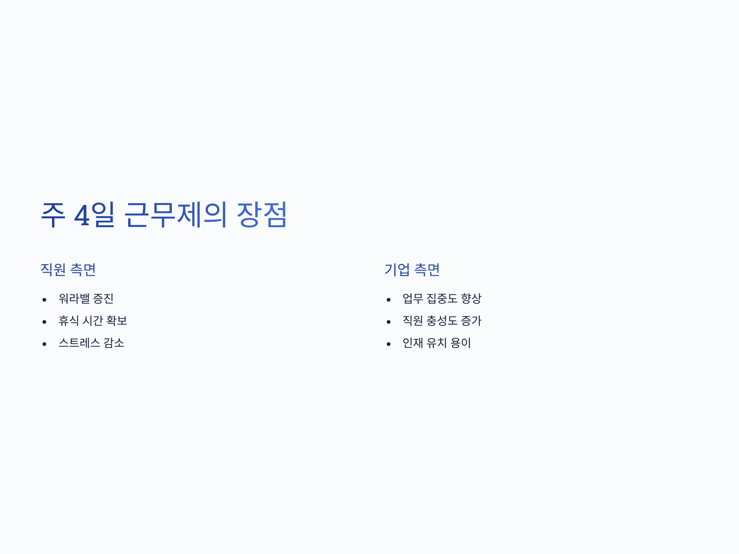 주 4일 근무제 도입이 가지는 가장 큰 장점은 무엇보다도 직원들의 워라밸을 증진시킬 수 있다는 점입니다. 많은 근로자들이 주 5일 근무로 인해 가족, 친구와의 시간이나 개인적인 취미를 즐기지 못하는 경우가 많았습니다. 하지만 주 4일 근무제가 시행되면 직원들은 더 많은 휴식 시간을 가질 수 있어 개인적인 삶을 풍요롭게 만들 수 있습니다. 이는 직원들의 스트레스 감소와 더 나아가 업무 효율성 증가로 이어질 수 있습니다.