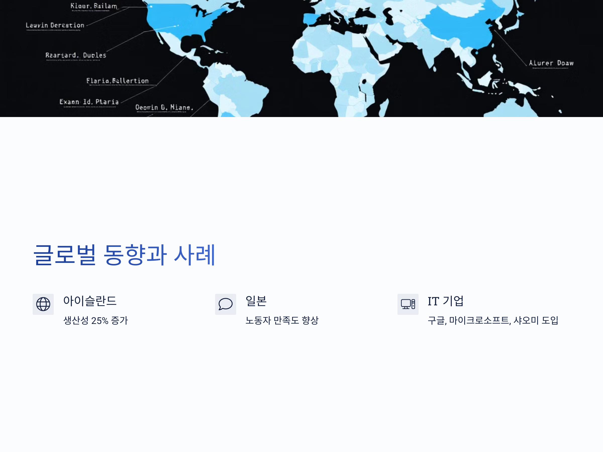 주 4일 근무제는 이미 일부 국가에서 시범적으로 도입되어 긍정적인 결과를 얻고 있습니다. 예를 들어, 아이슬란드와 일본은 몇 년 전부터 주 4일 근무제를 시범 도입한 결과, 노동자들의 만족도가 높고 생산성 또한 증가했다는 연구 결과를 발표했습니다. 특히 아이슬란드에서는 2015년부터 2019년까지 진행된 시범 사업에서, 주 4일 근무를 실시한 근로자들의 생산성이 오히려 25% 증가했다고 보고되었습니다. 이러한 성공적인 사례들은 주 4일 근무제가 가능하다는 믿음을 확산시키고 있으며, 다른 나라들도 이를 본격적으로 도입하는 방향으로 나아가고 있습니다.