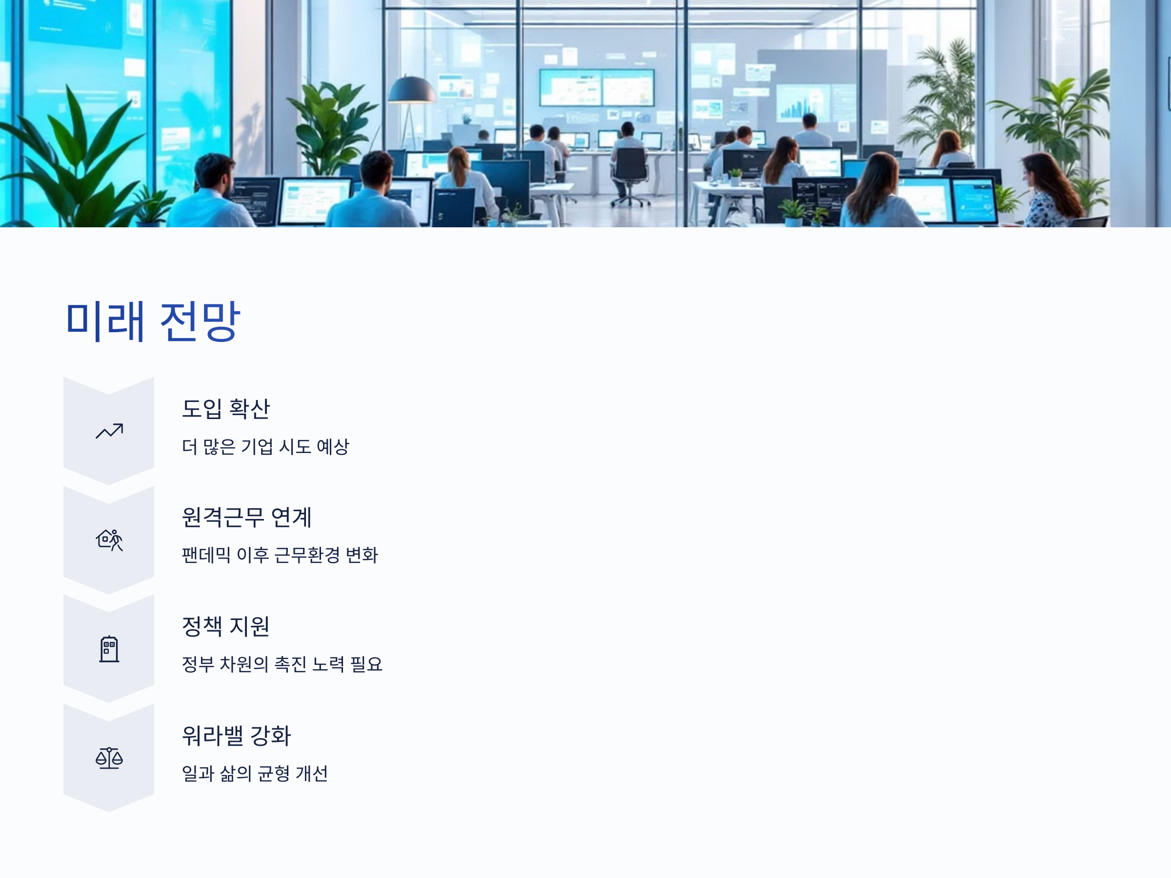 주 4일 근무제의 도입은 앞으로 점점 더 많은 기업에서 시도할 가능성이 높습니다. 특히, 기업들이 직원들의 행복과 생산성을 동시에 고려하는 방향으로 나아가면서, 근로 시간 단축에 대한 논의는 더욱 활발해질 것입니다. 특히, 팬데믹을 거치며 원격 근무가 확산되면서 근로 환경에 대한 고민이 깊어졌고, 주 4일 근무제 도입은 그 해결책 중 하나로 부각되고 있습니다.