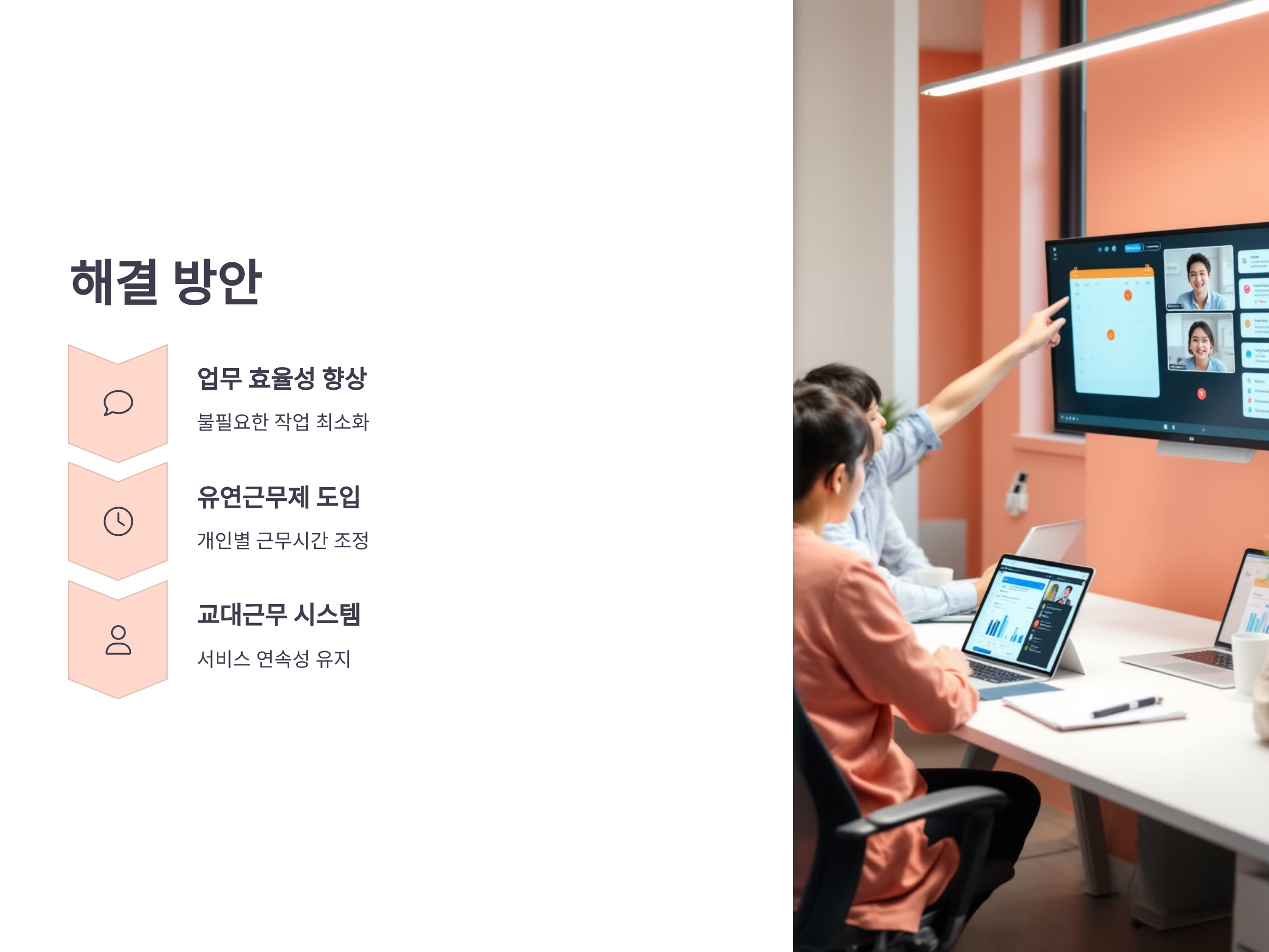 또한, 모든 산업군에 주 4일 근무제가 적용될 수 있는 것은 아닙니다. 예를 들어, 의료업계나 서비스업 등은 여전히 24시간 운영이 필요하거나 고객과의 직접적인 소통이 중요한 경우가 많기 때문에, 주 4일 근무제가 도입되기 어려운 경우가 있습니다. 이를 해결하려면 유연근무제나 교대근무를 도입하여 근무 시간을 조정하는 방식으로 접근할 수 있습니다.