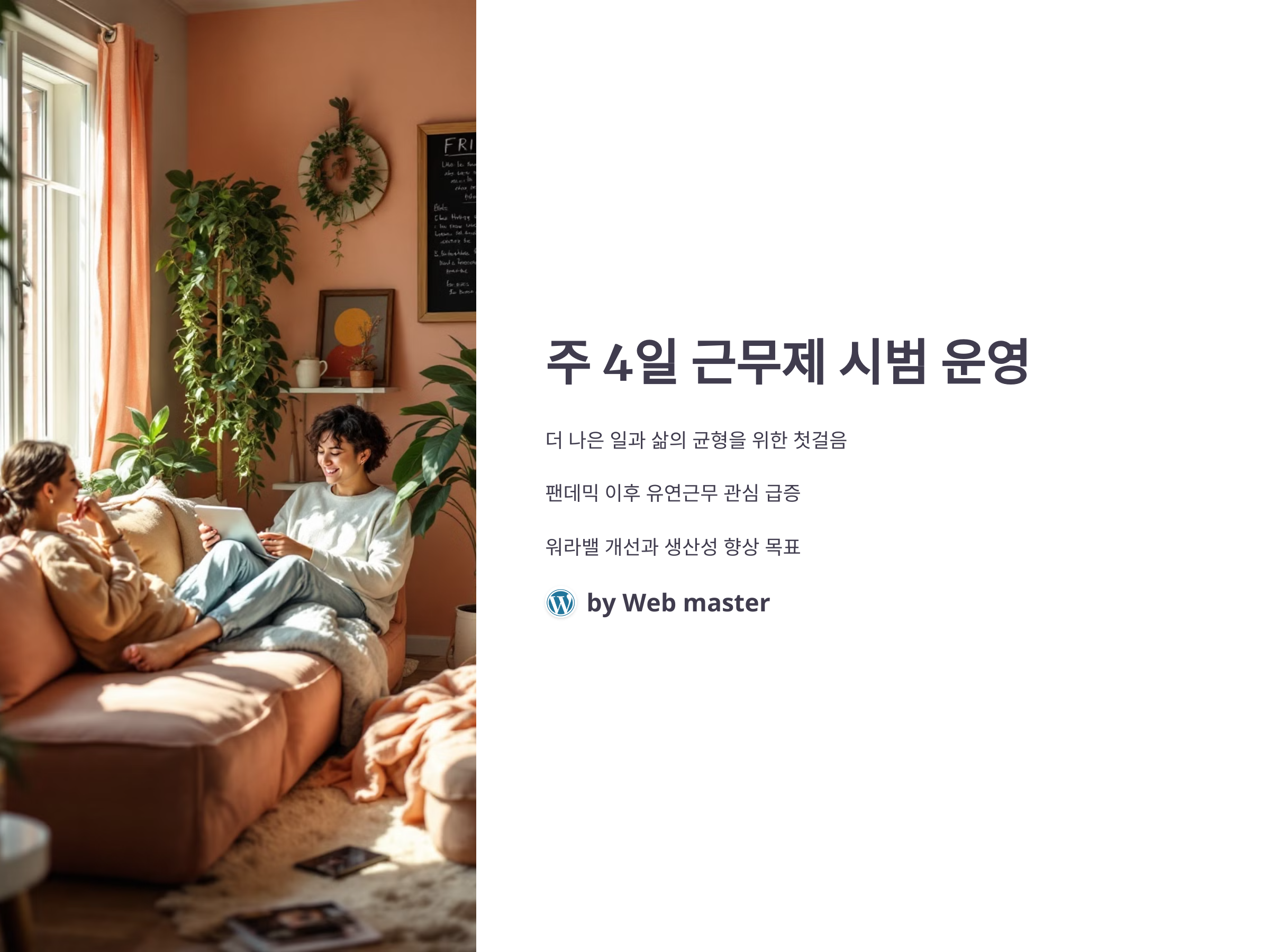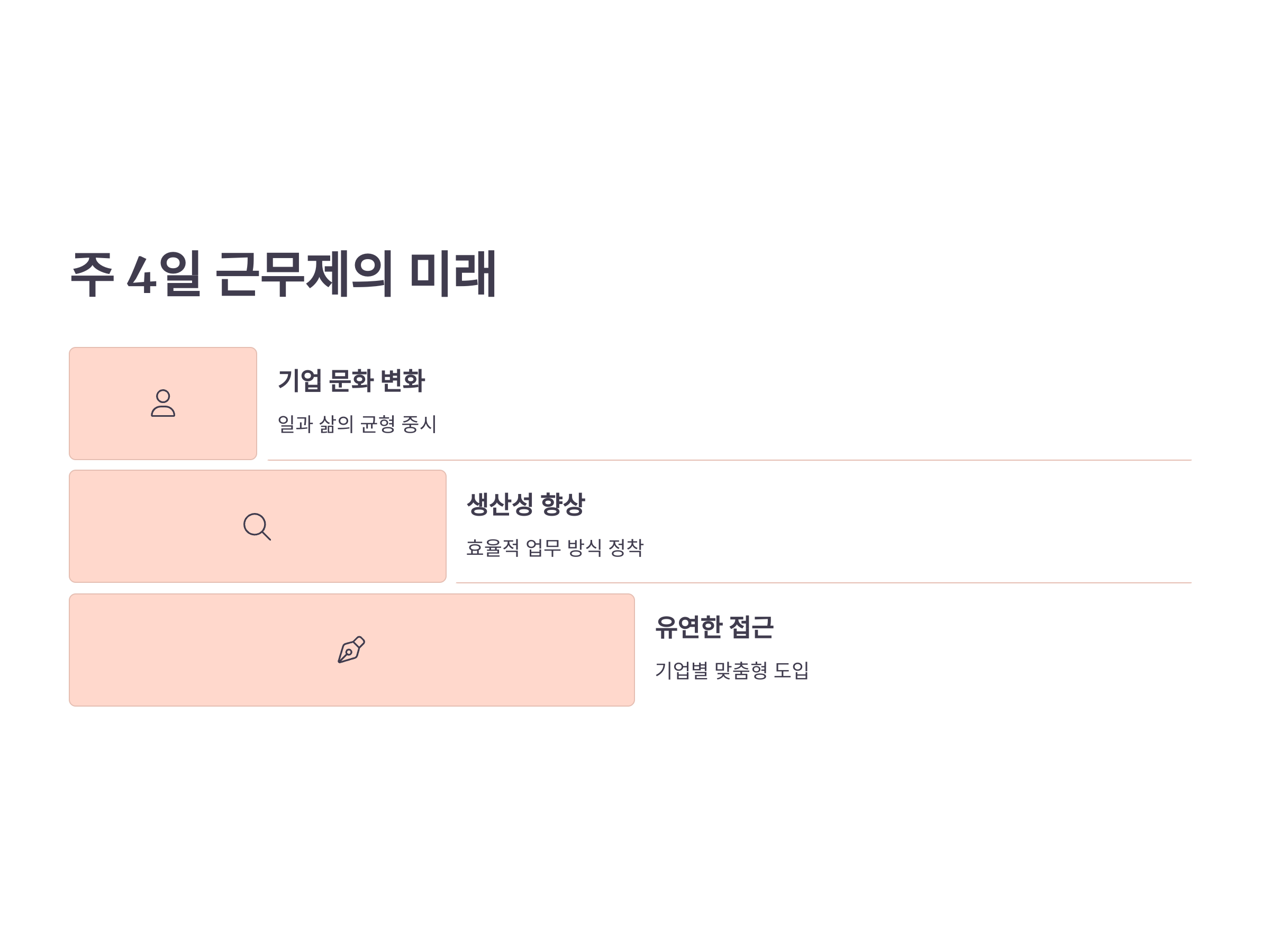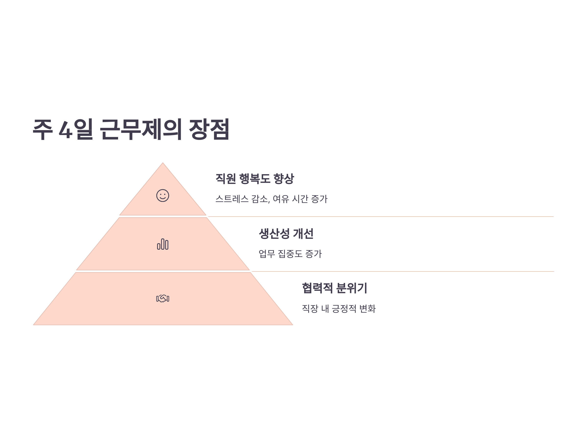 주 4일 근무제의 가장 큰 장점 중 하나는 바로 워라밸 향상입니다. 주 5일 근무제로 인한 과도한 업무 스트레스와 시간 부족 문제를 해결하고, 직원들이 더 많은 개인 시간을 가질 수 있게 돕습니다. 또한, 일하는 시간을 효율적으로 관리하여 업무 집중도를 높이는 효과도 있습니다. 다만, 이러한 근무 형태가 모든 산업에 적용될 수 있는 것은 아니므로, 각 기업의 상황에 맞는 적절한 조정이 필요합니다.