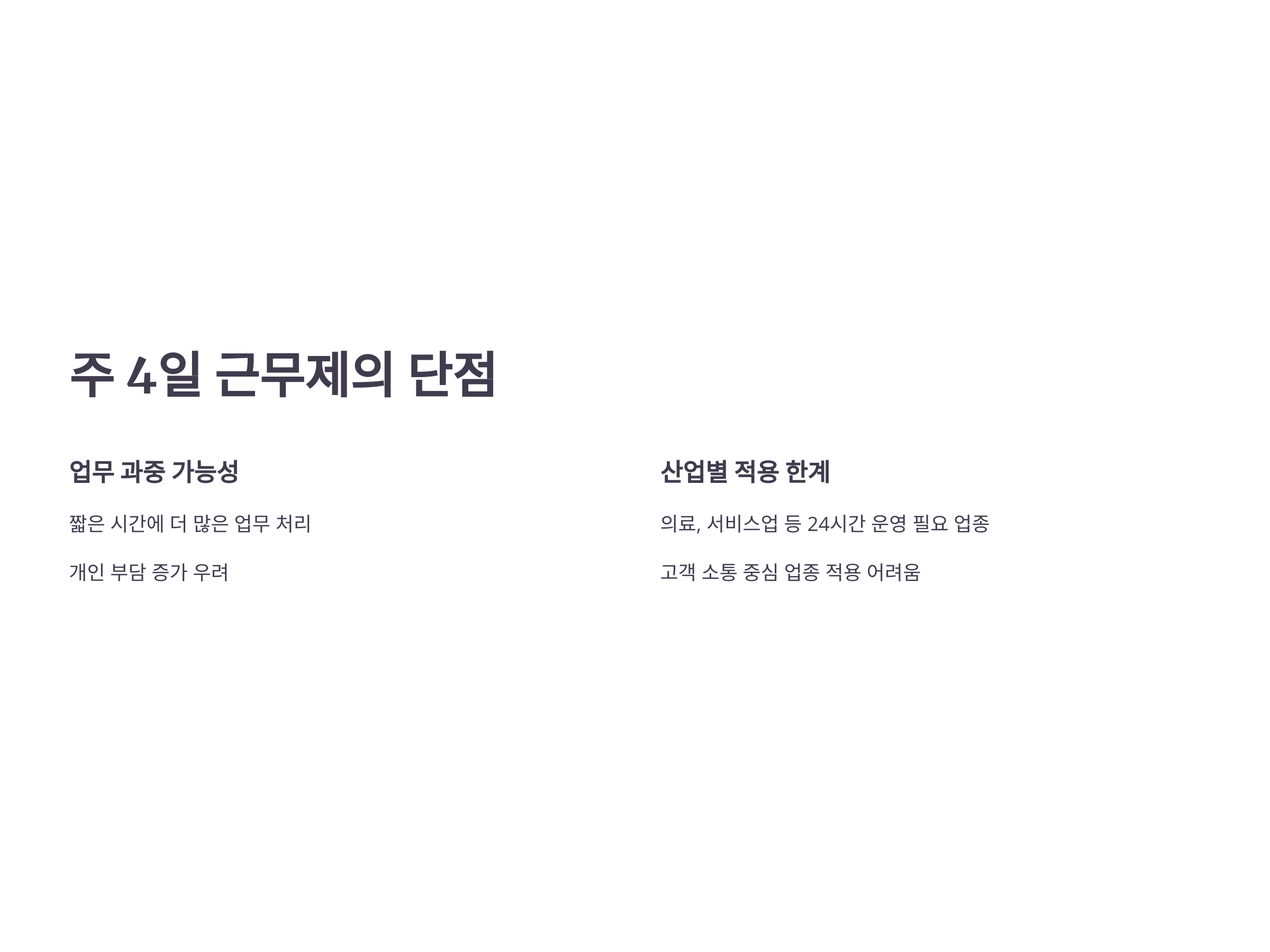 하지만 모든 변화가 그렇듯, 주 4일 근무제도 몇 가지 단점을 동반할 수 있습니다. 첫 번째 문제는 업무의 과중입니다. 근무 시간이 줄어들면서 직원들이 하루에 더 많은 업무를 처리해야 하는 상황이 발생할 수 있습니다. 이로 인해 근무 시간이 짧아지더라도, 각 직원의 부담이 커지면 오히려 스트레스가 증가할 수 있습니다. 이를 해결하기 위해서는 업무의 효율성을 높이고, 불필요한 작업을 최소화하는 방법이 필요합니다.