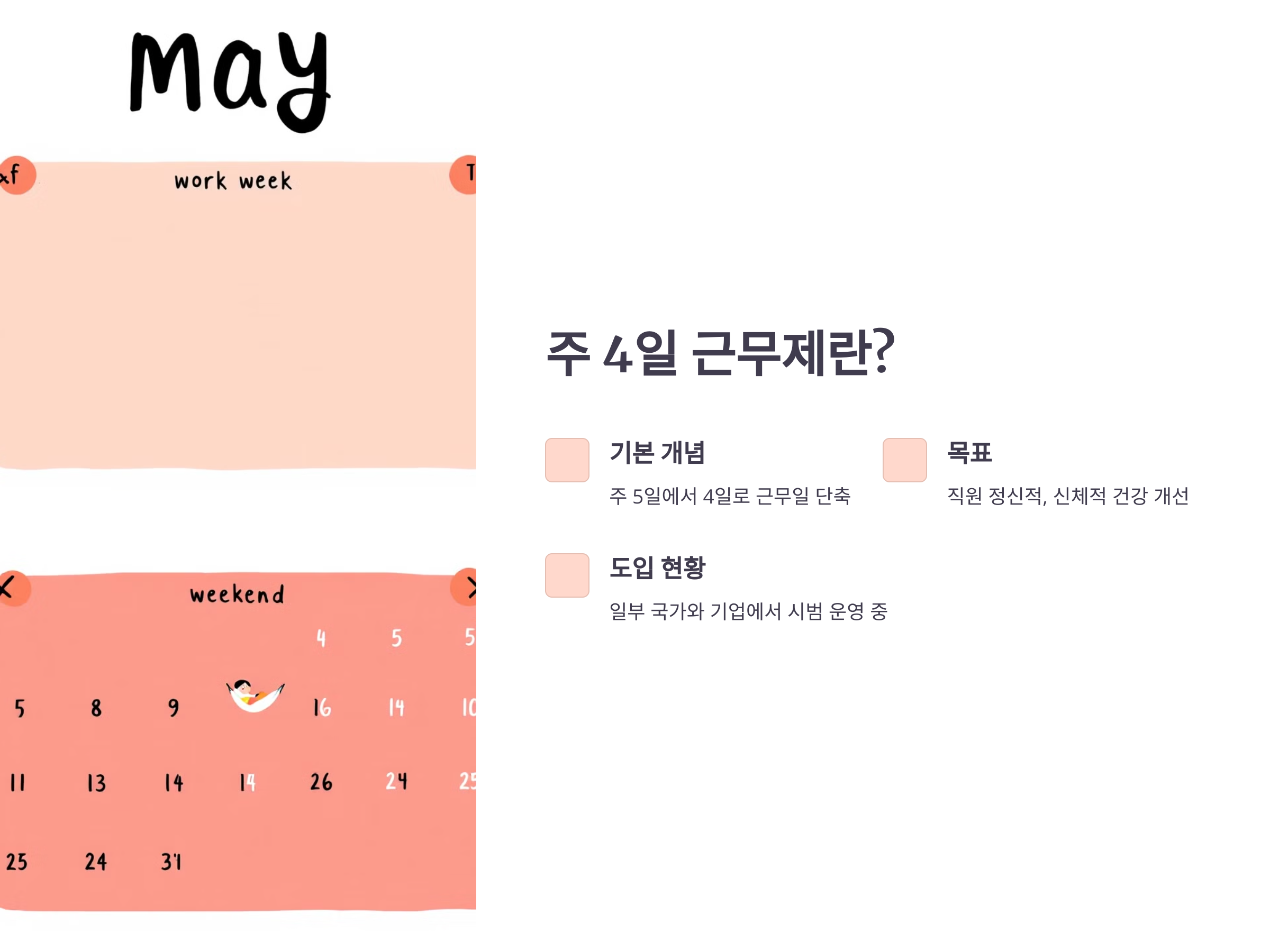 주 4일 근무제는 이름 그대로 일주일에 4일만 근무하고, 나머지 3일은 휴식을 취하는 근무 방식입니다. 이는 전통적인 주 5일 근무제에 비해 근무일 수를 줄이고, 직원들의 휴식을 더 많이 보장하는 시스템입니다. 주 4일 근무제가 도입된 나라와 기업들은 이 제도가 직원들의 정신적, 신체적 건강을 개선하고, 근무 효율성을 높일 수 있다고 주장하고 있습니다. 실제로 일부 국가에서는 국가적 차원에서 이 제도를 시범 운영하거나 도입하기 시작했으며, 일부 기업은 이미 이 모델을 채택하여 성공적인 결과를 얻고 있습니다.