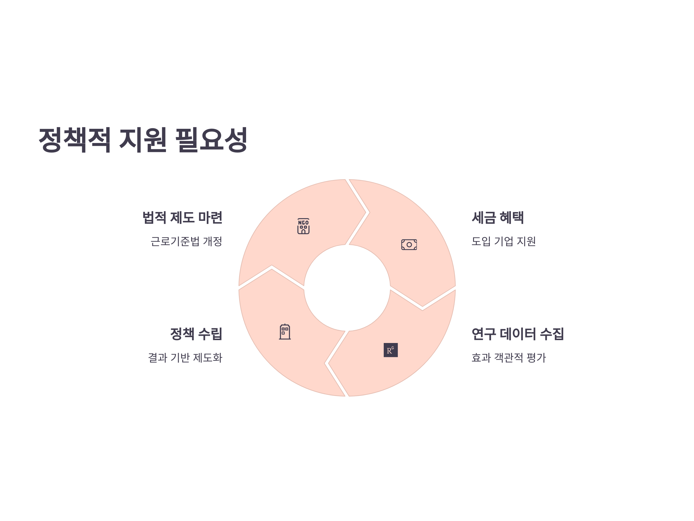 주 4일 근무제를 널리 도입하기 위해서는 정책적인 지원이 필요합니다. 기업들이 주 4일 근무제를 시행할 수 있도록 법적, 제도적 지원이 마련되어야 하며, 각국 정부는 이를 장려하기 위한 정책을 개발해야 합니다. 예를 들어, 정부는 주 4일 근무제를 도입한 기업에 대해 세금 혜택을 제공하거나, 근로자들에게 휴가 기간을 늘려주는 등의 지원을 할 수 있습니다.