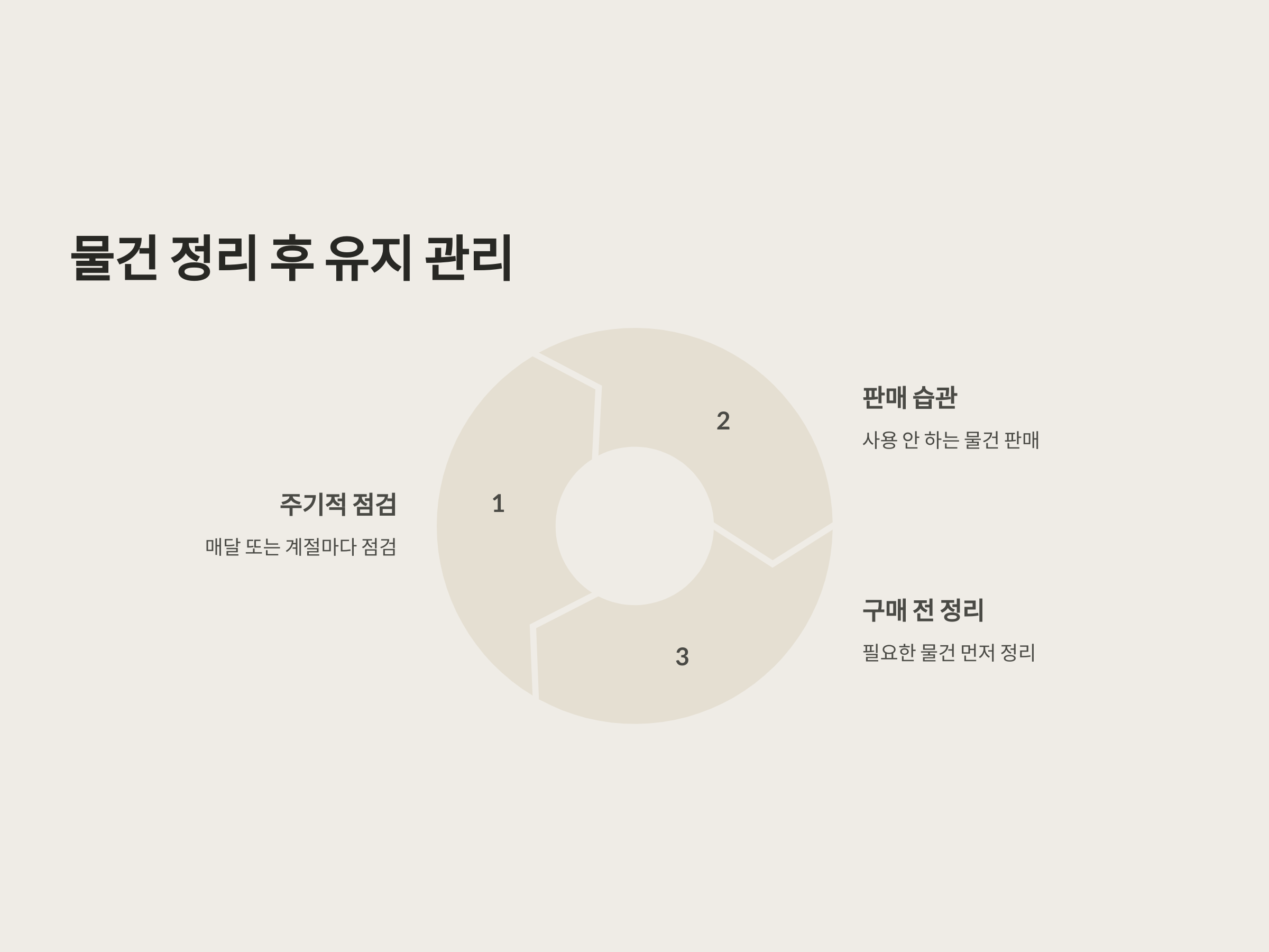 불필요한 물건을 한 번에 처리했다고 해서 다시 물건이 쌓이지 않도록 주의해야 합니다. 주기적으로 집 안을 정리하는 습관을 들이면, 불필요한 물건이 쌓이는 일이 적어집니다.