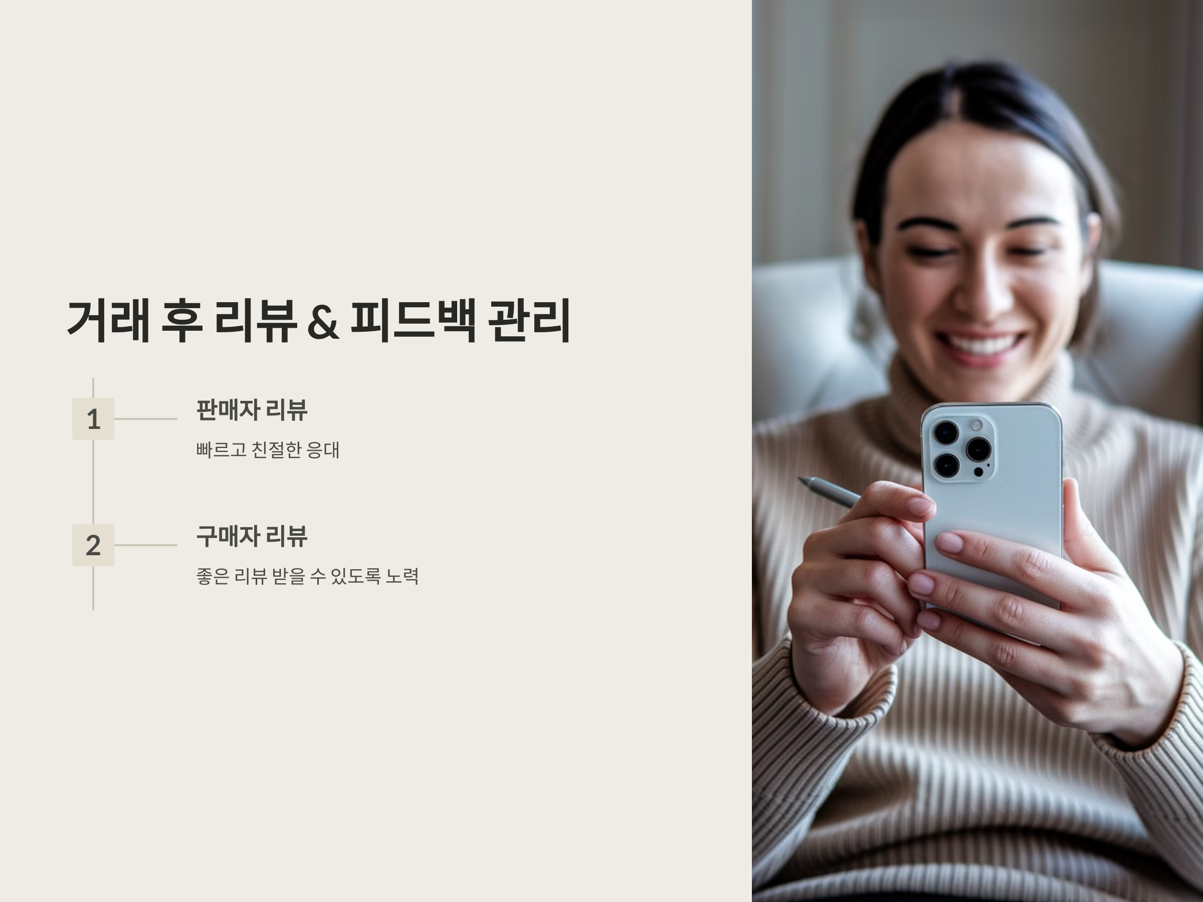 중고거래 후에는 상대방의 평가와 피드백을 주고받을 수 있습니다. 리뷰 시스템을 통해 거래 상대방의 신뢰도를 파악할 수 있기 때문에, 거래 후 긍정적인 리뷰를 남겨주는 것이 중요합니다.