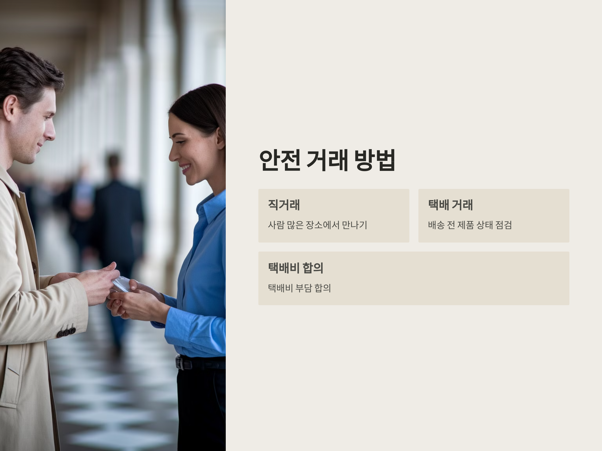 중고거래의 큰 매력 중 하나는 직거래나 택배 거래를 통해 빠르게 물건을 팔 수 있다는 점입니다. 그러나 안전한 거래를 위해서는 몇 가지 유의사항을 지켜야 합니다: