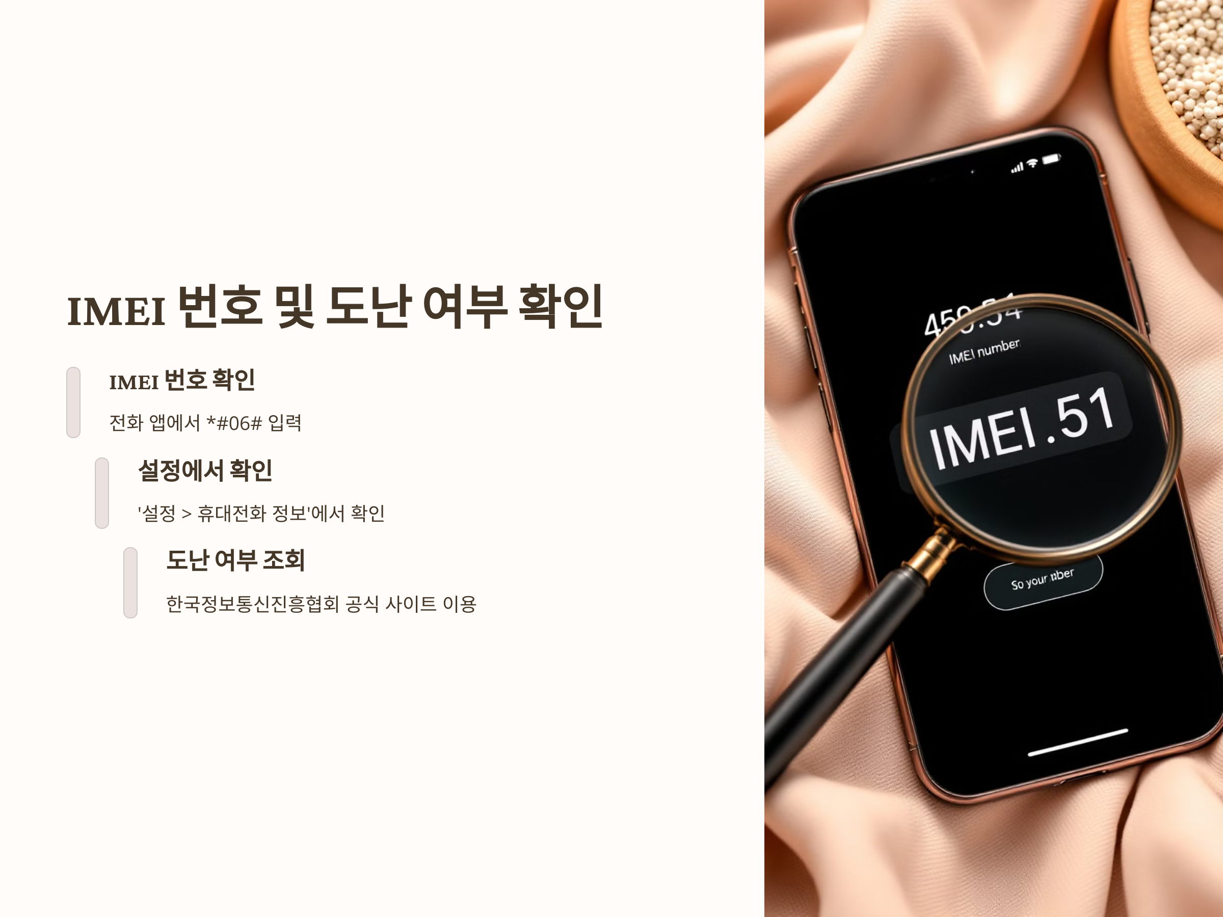 - IMEI 번호 확인 방법: 전화 앱에서 *#06#을 입력하거나, '설정 > 휴대전화 정보'에서 확인할 수 있습니다.