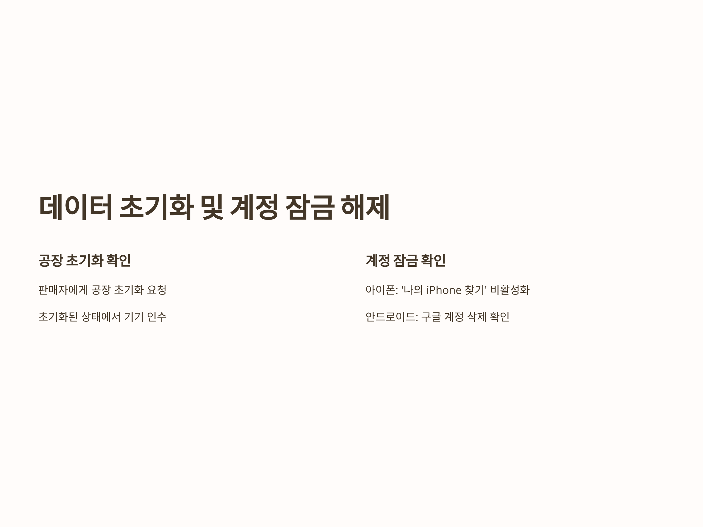 이전 사용자의 데이터가 남아 있거나 계정이 잠겨 있는 기기는 정상적으로 사용할 수 없으므로, 구매 전에 반드시 확인해야 합니다.