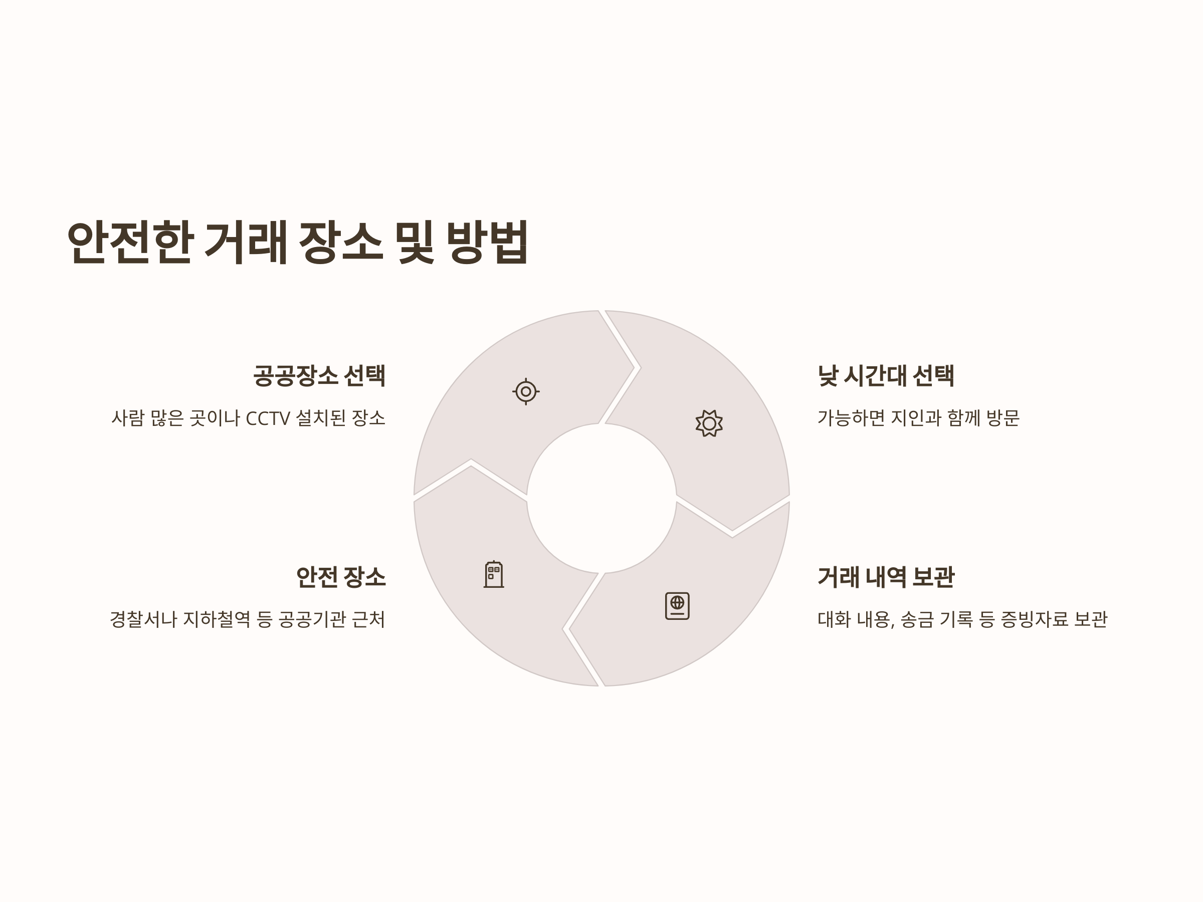 - 거래 시간: 낮 시간대를 선택하고, 가능하면 지인과 함께 거래 장소에 가는 것이 좋습니다.
