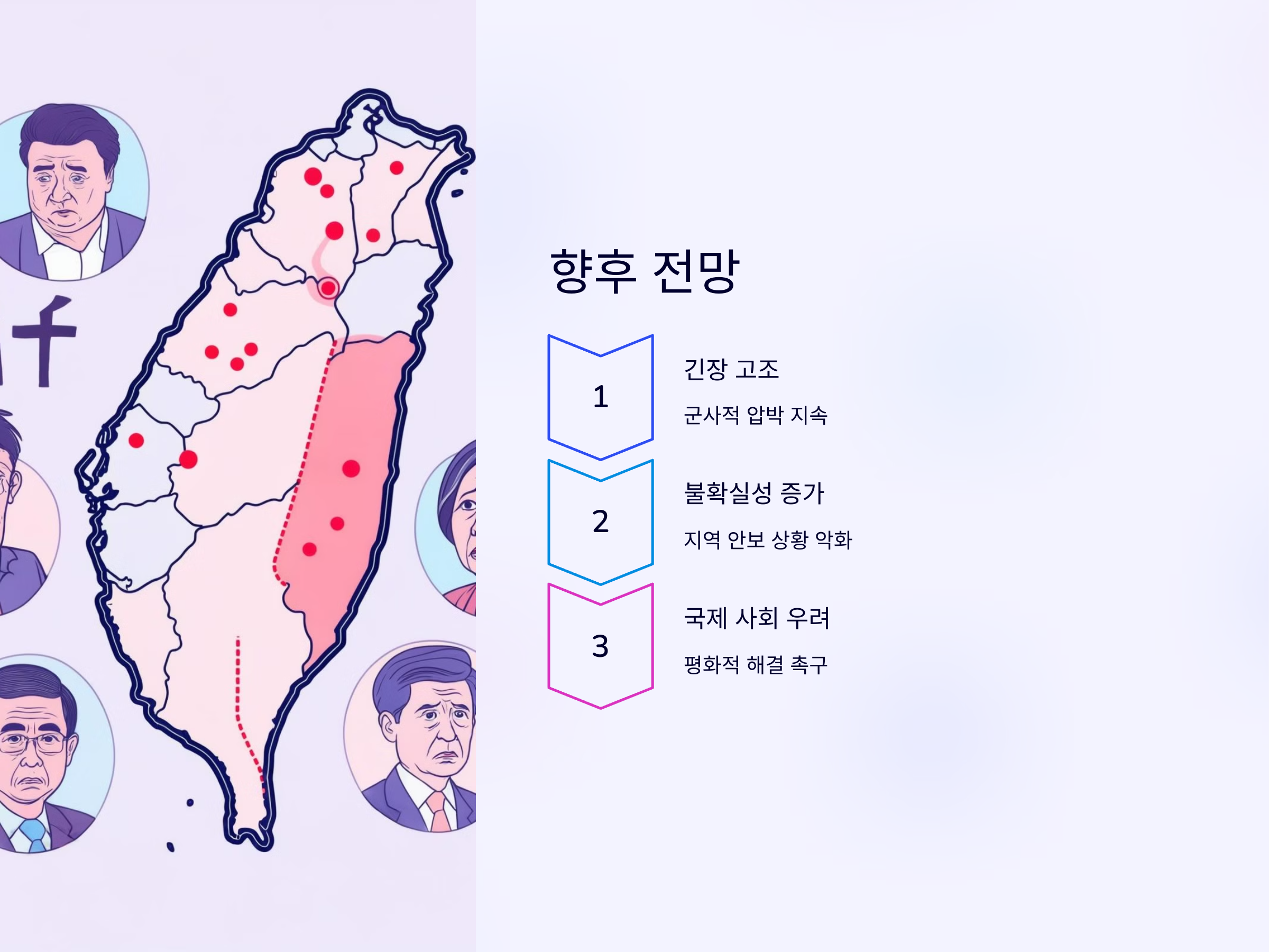 중국과 대만 간의 군사적 긴장은 갈수록 심화되고 있으며, 국제 사회의 우려를 낳고 있습니다. 중국은 군사적 압박을 통해 대만을 정치적으로, 경제적으로 고립시키려는 전략을 지속하고 있으며, 대만은 이에 대한 대응 전략을 강화하고 있습니다. 양측의 군사적 충돌을 피하면서도 긴장이 고조되는 상황에서, 향후 이 지역의 안보 상황은 더욱 불확실해질 것으로 보입니다【6†source】【8†source】.