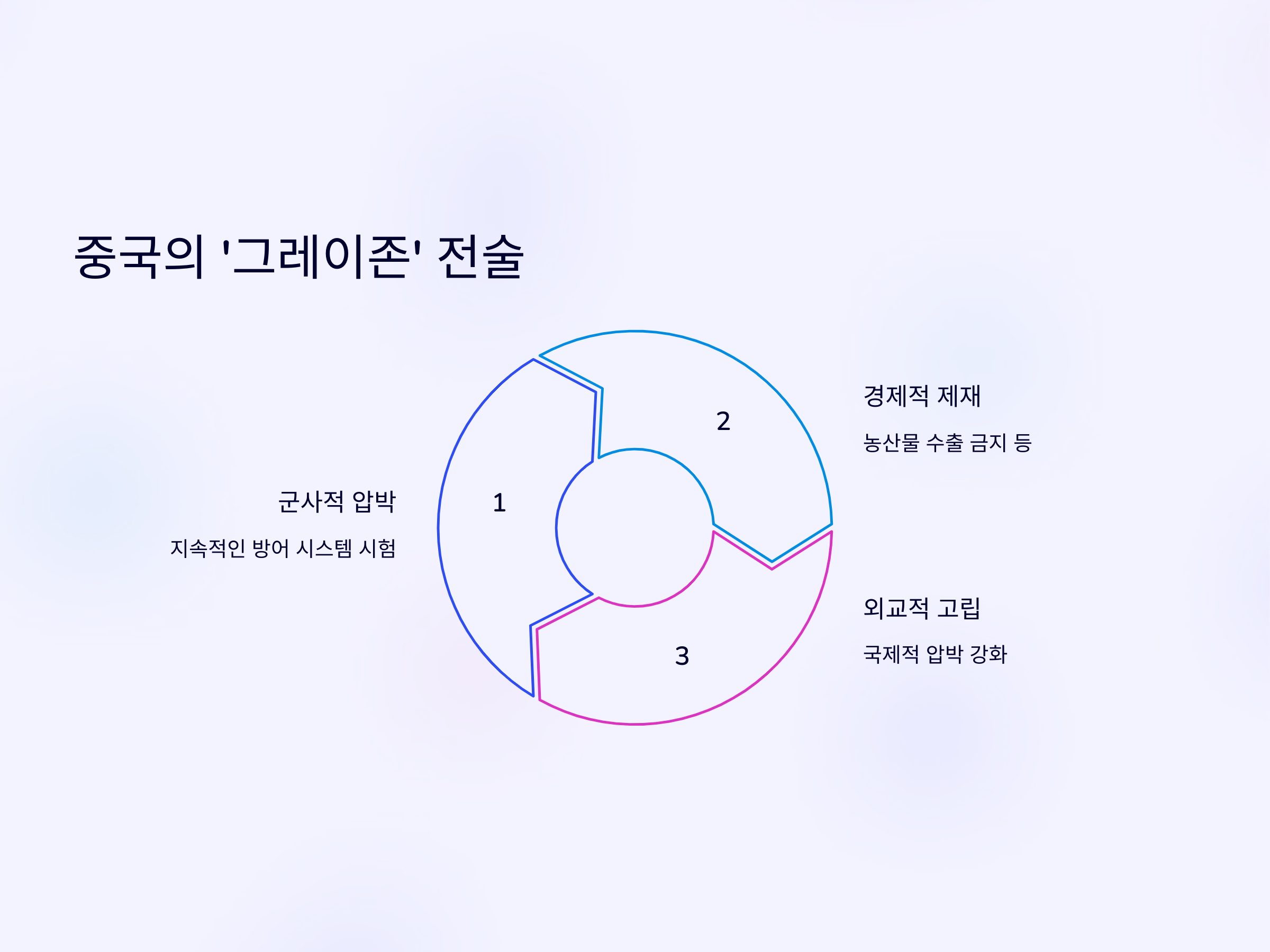 중국의 군사 활동은 이제 단순한 군사적 충돌을 넘어서는 "그레이존" 전술을 채택하고 있습니다. 이 전술은 전쟁 상태에 돌입하지 않으면서도 경제적, 군사적 압박을 통해 대만을 지치게 만들려는 전략입니다. "그레이존" 전술은 중국이 군사 기동을 통해 대만의 방어 시스템을 지속적으로 시험하고, 대만 국민들로 하여금 중국의 압박에 익숙해지게 만드는 방식으로 진행되고 있습니다【8†source】.
