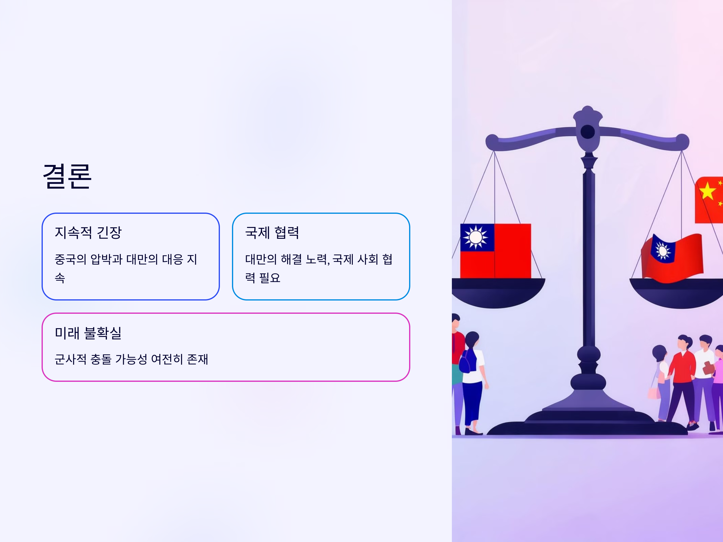 중국과 대만 간의 군사적 긴장은 앞으로도 지속될 가능성이 큽니다. 중국의 군사적 압박과 '그레이존' 전술은 대만에 큰 부담을 주고 있으며, 대만은 이를 해결하기 위한 전략을 마련하고 있습니다. 하지만 무력 충돌을 피하려는 대만의 노력이 결국 국제 사회와의 협력에 달려있다고 볼 수 있습니다【7†source】【8†source】.