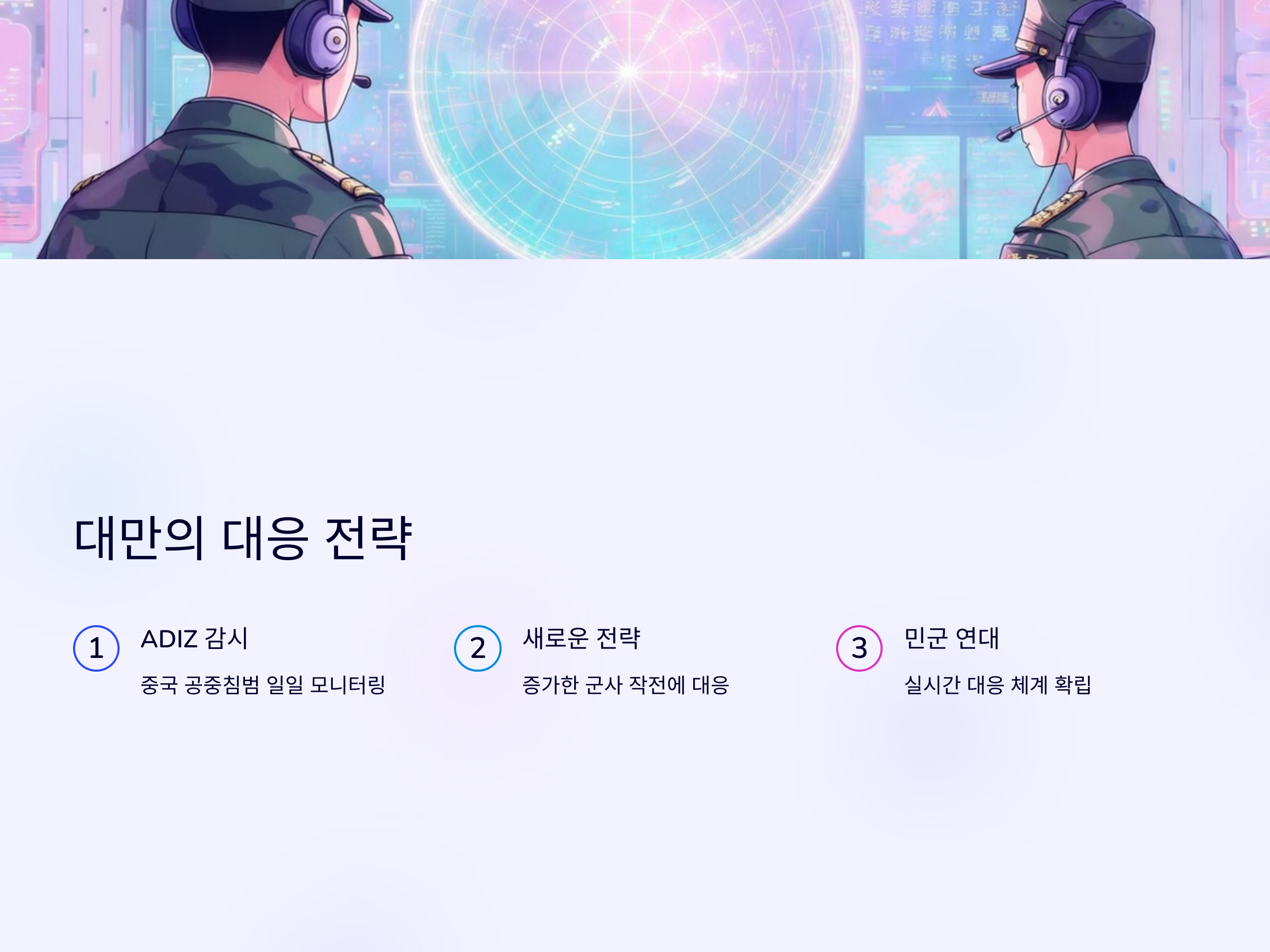 대만은 매일 중국의 군사 작전과 공중침범을 감시하며 대응해야 하는 상황에 놓여 있습니다. 특히, 대만의 공중방위식별구역(ADIZ)은 국제적으로 인정받지 않는 영역이지만, 대만의 방어력과 대응 시간을 제한하는 중요한 방어선 역할을 합니다. 최근 대만은 중국의 무력 시위로 인해 급격히 증가한 군사 작전에 대응하기 위해 새로운 전략을 채택하고 있습니다【6†source】.