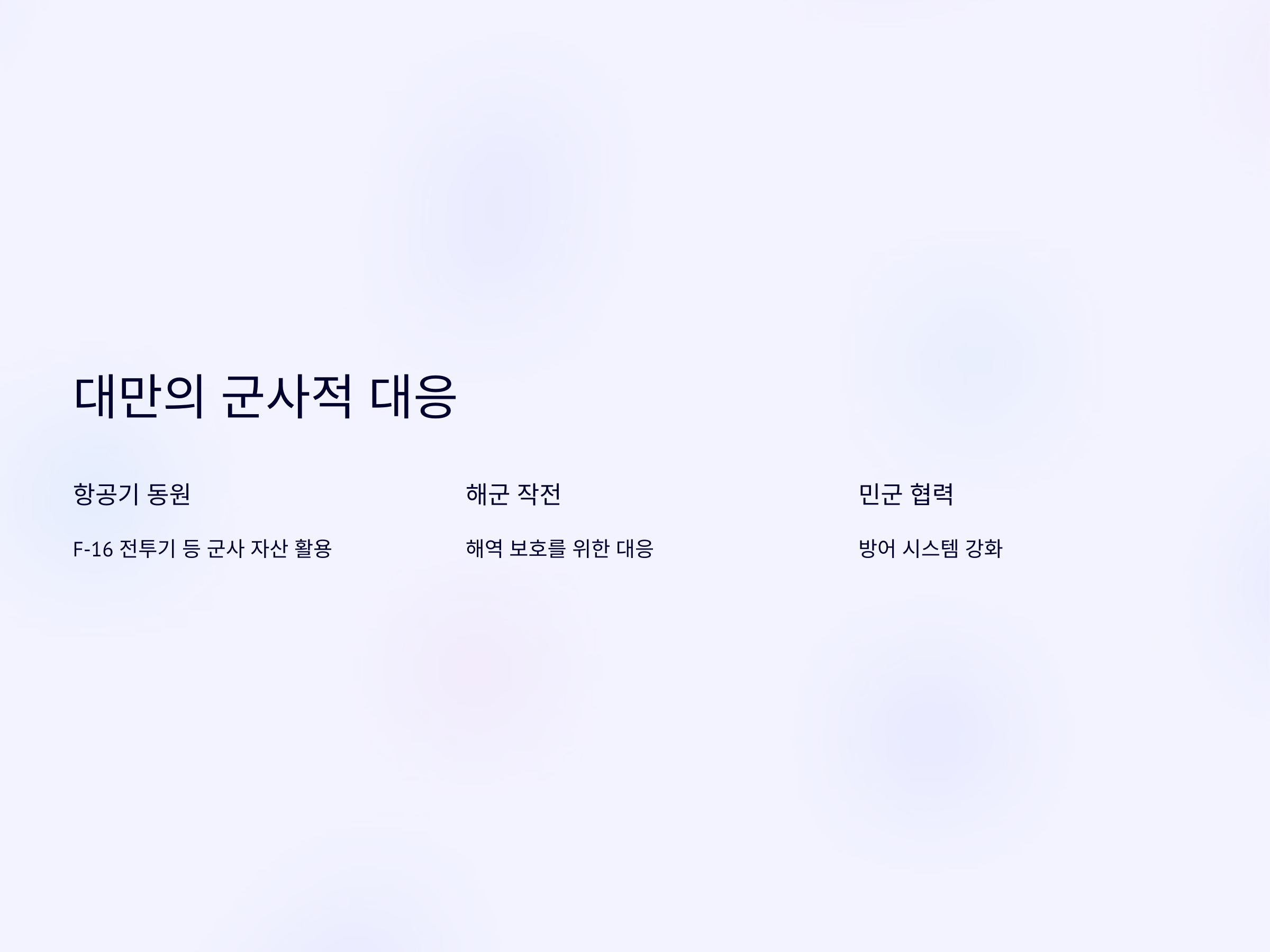 - A2: 대만은 군사적 대응을 강화하고 있으며, 민간과 군 간 협력 체계를 발전시키고 있습니다. 또한, 외교적 방법을 통해 국제 사회와의 연대를 강화하고 있습니다【6†source】.