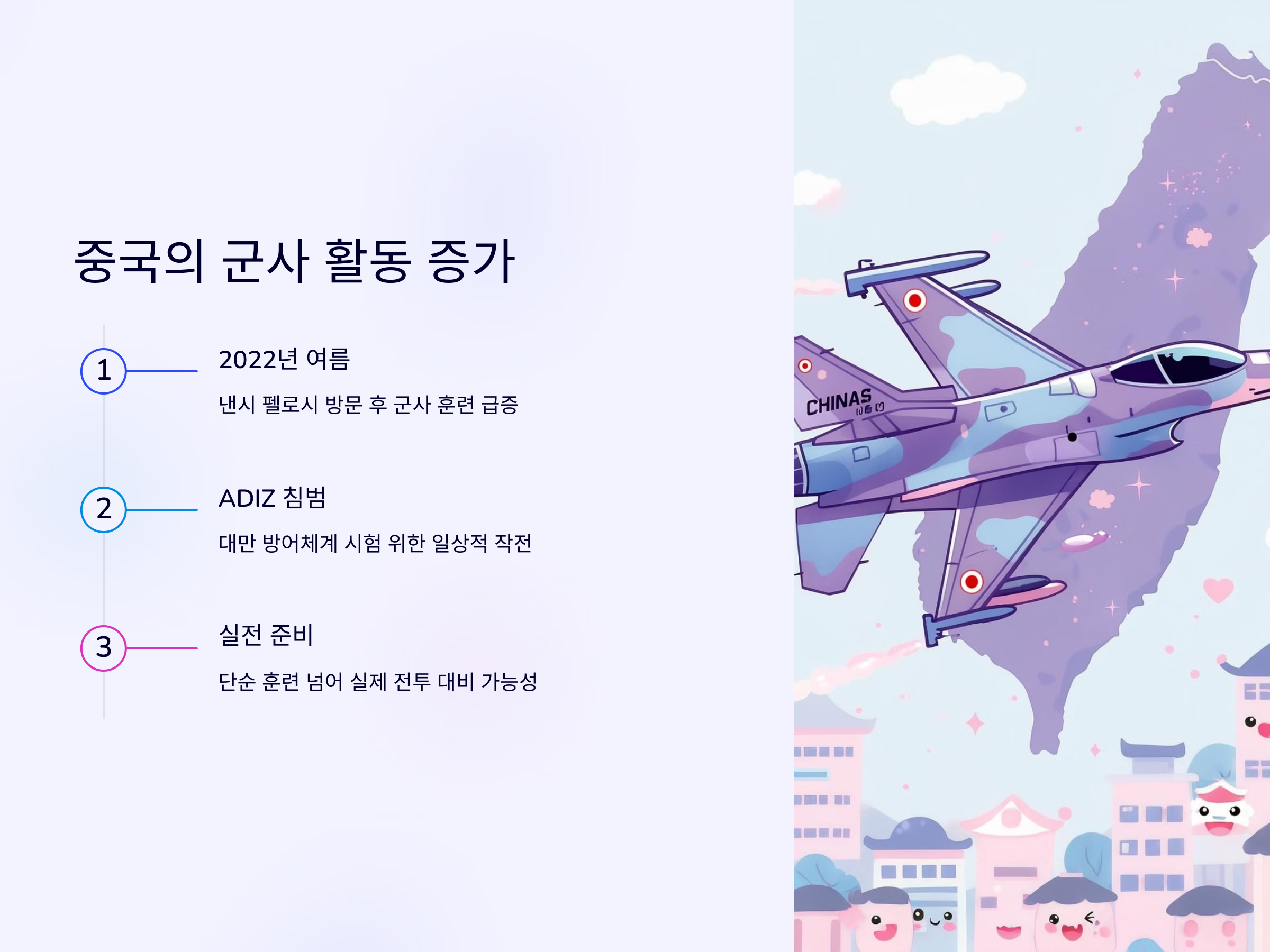 중국의 대만 인근 군사 훈련은 특히 2022년 여름, 낸시 펠로시 전 미국 하원 의장의 대만 방문 이후 급격히 증가했습니다. 이 방문은 중국을 격분시켰고, 대만 주변에서의 군사적 활동을 강화하는 계기가 되었습니다【7†source】. 그 이후 중국은 대만의 공중방위식별구역(ADIZ)을 침범하는 군사 작전을 매일같이 반복하며, 대만의 방어 체계를 시험하고 있습니다【8†source】.