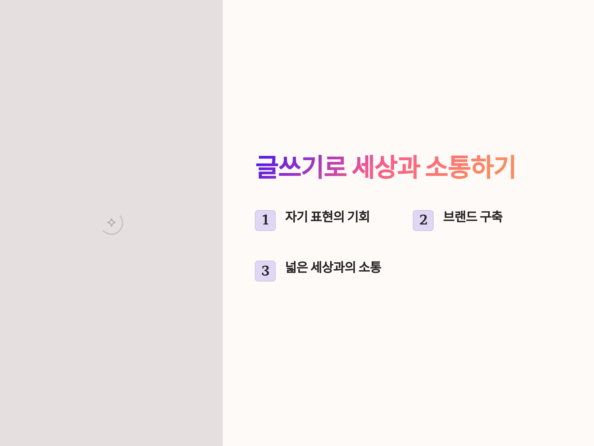 이 강좌에서는 주로 일상적인 주제를 다루면서, 감정을 잘 표현하는 방법과 독자에게 전달되는 느낌을 중심으로 강의가 진행됩니다. 누구나 자신감을 가지고 글을 쓸 수 있도록 돕는 것이 이 강좌의 특징입니다.