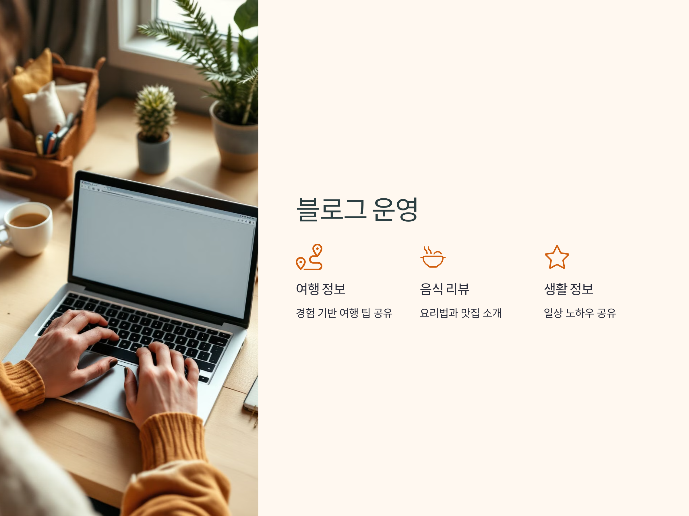 블로그 운영은 중장년층에게 아주 좋은 온라인 부업입니다. 특히 여행, 음식, 생활 정보 등 자신이 관심 있는 분야에 대해 글을 쓰는 것이 좋습니다. 꾸준히 글을 쓰다 보면, 자신의 경험과 노하우를 공유하는 블로그가 되어 방문자 수가 증가하고, 이를 통해 수익을 창출할 수 있습니다.