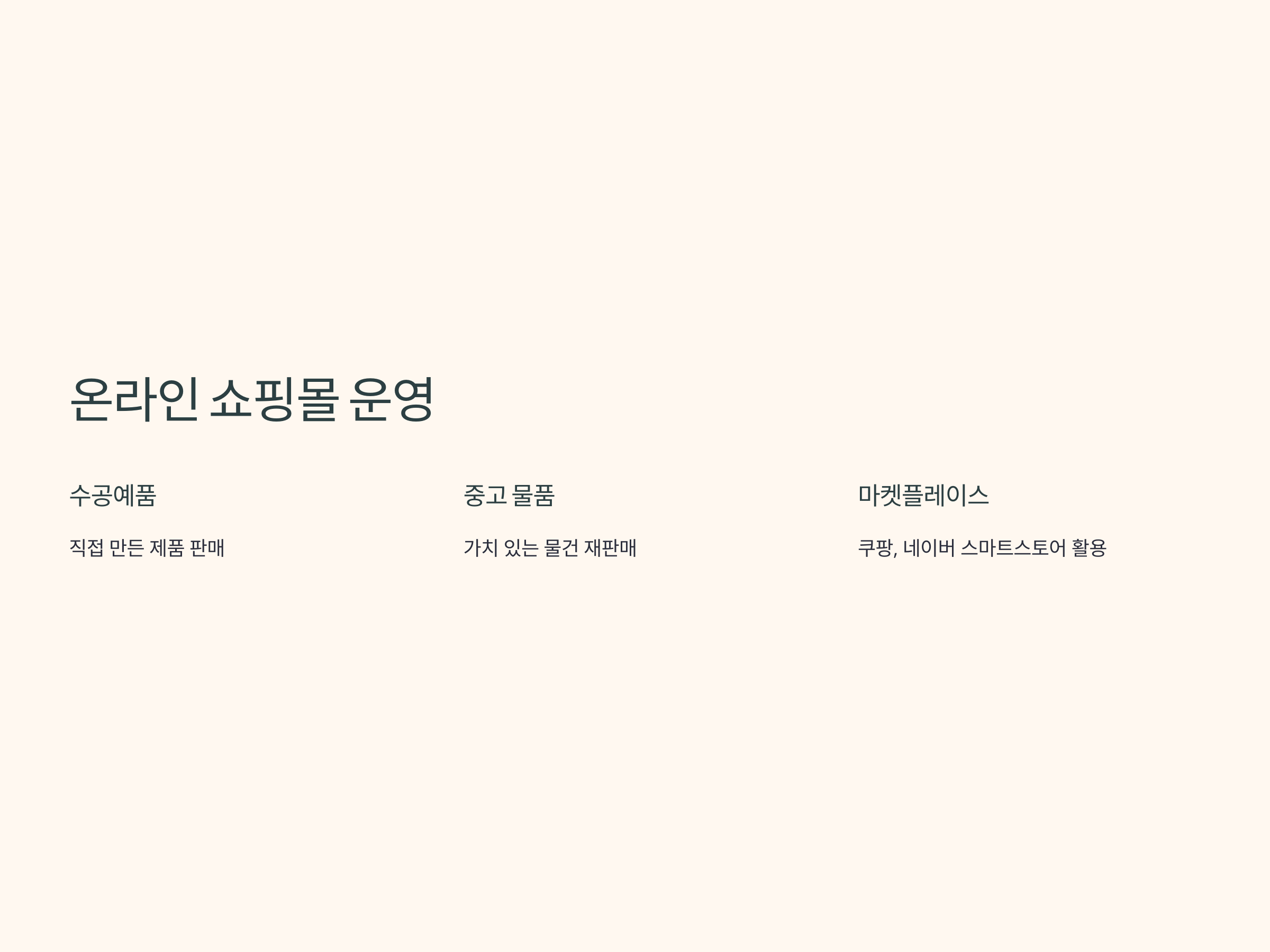 온라인 쇼핑몰 운영은 제품을 직접 만들거나 유통하는 중장년층에게 적합한 부업입니다. 수공예품, 중고 물품, 또는 온라인에서 인기 있는 제품들을 판매할 수 있습니다. 특히 요즘은 개인 쇼핑몰을 운영하거나, 마켓플레이스(예: 쿠팡, 네이버 스마트스토어)에서 상품을 판매하는 일이 더 쉬워졌습니다.