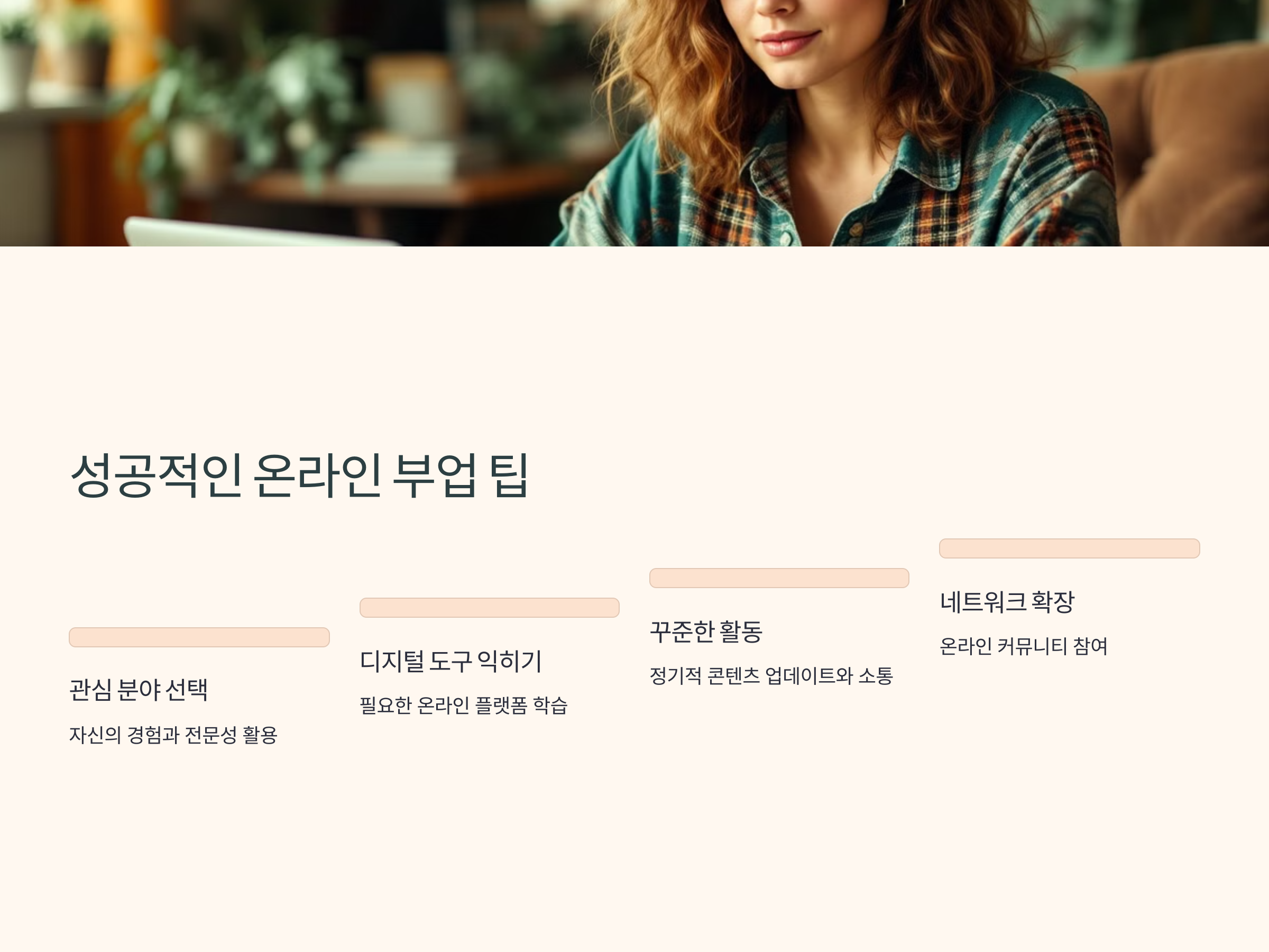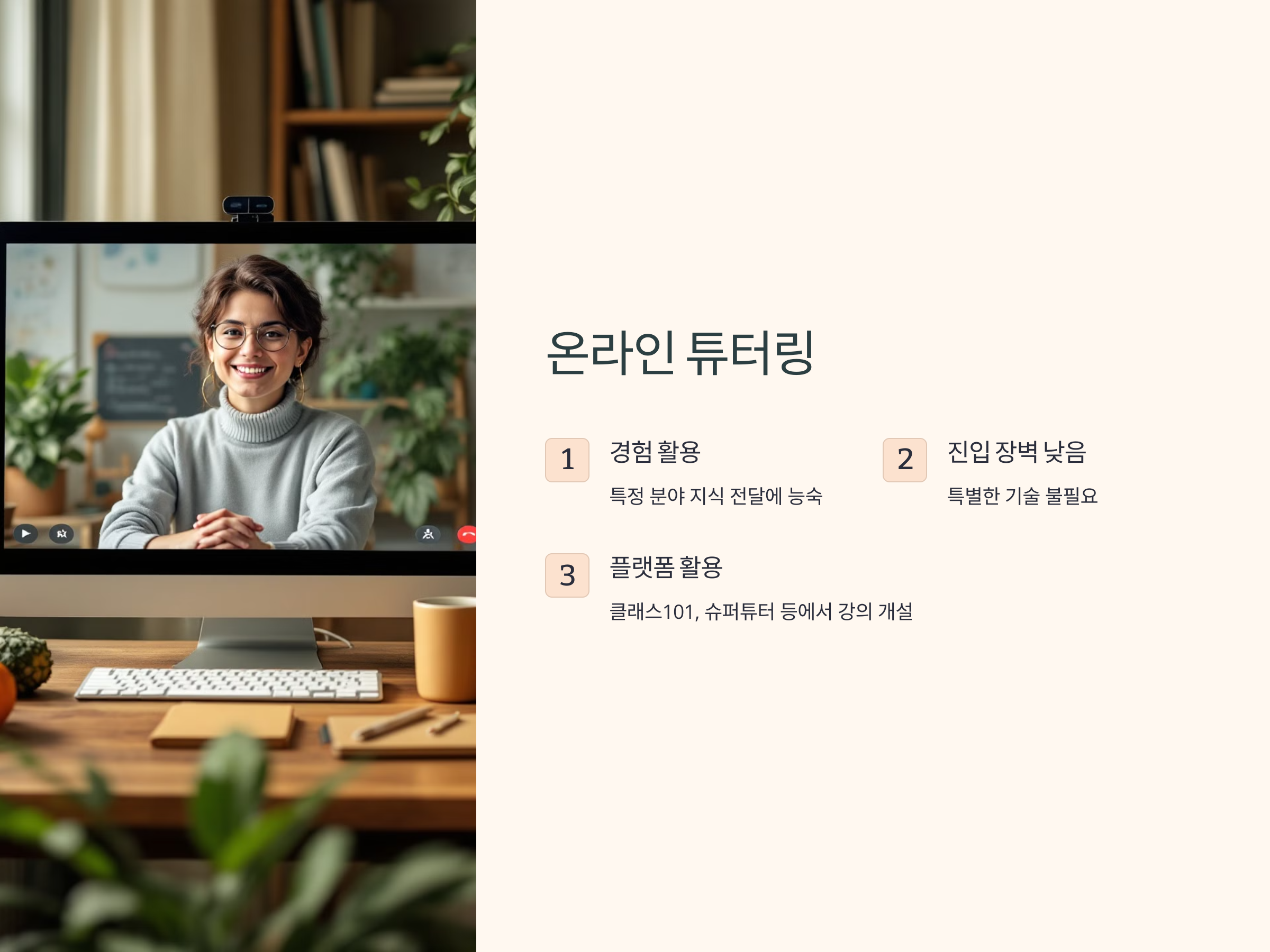 온라인 튜터링은 특별한 기술이 필요하지 않으며, 주로 자신이 잘 아는 분야를 가르치는 것이기 때문에 중장년층에게 아주 적합합니다. 다양한 온라인 플랫폼(예: 클래스101, 슈퍼튜터)에서 쉽게 강의를 개설할 수 있으며, 점차 인기를 끌면서 부가 수익을 얻을 수 있습니다.