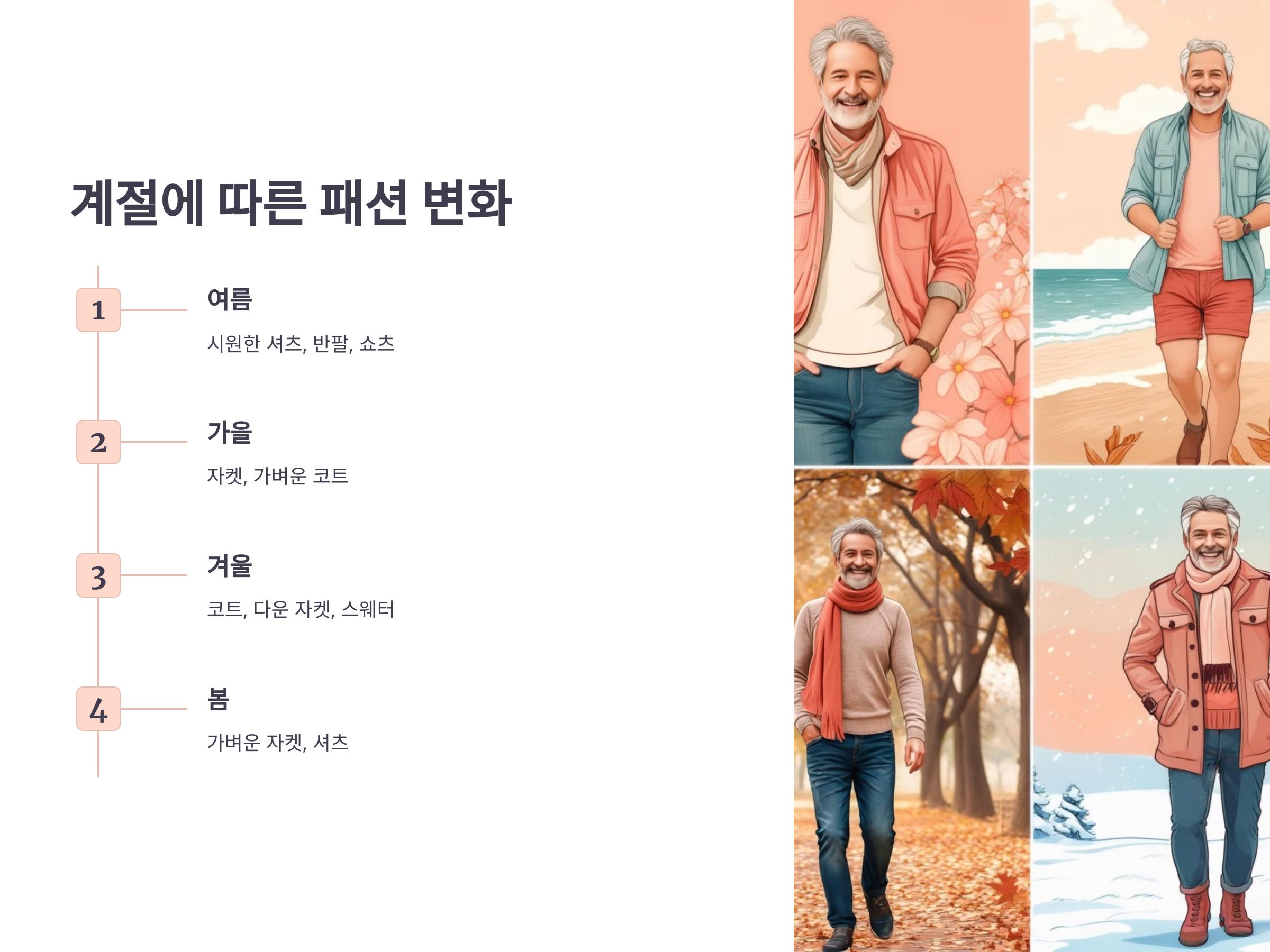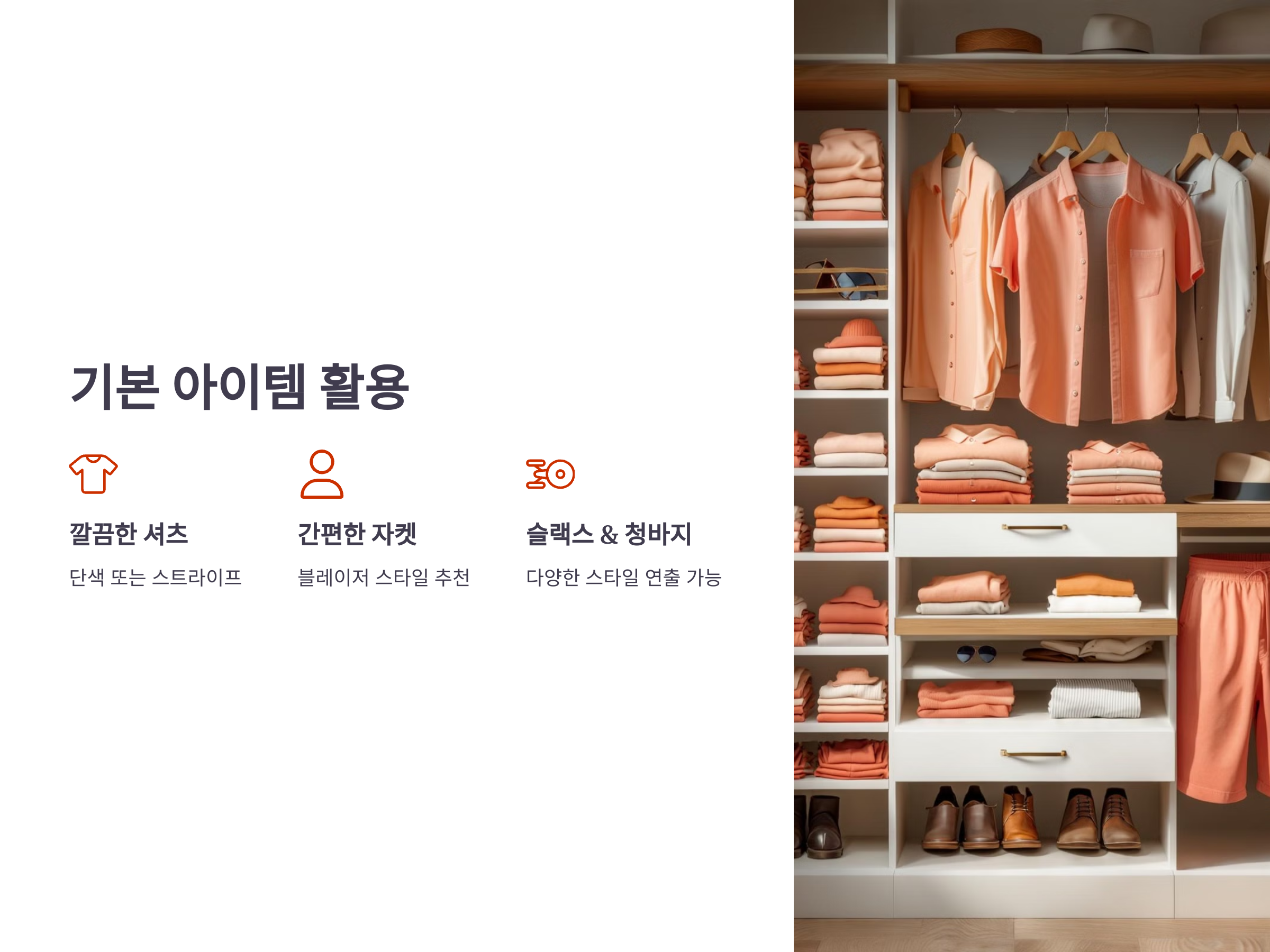 - 여름: 시원하고 가벼운 소재의 셔츠, 반팔 티셔츠, 쇼츠를 활용해보세요. 더위 속에서도 깔끔한 스타일을 유지할 수 있습니다.
