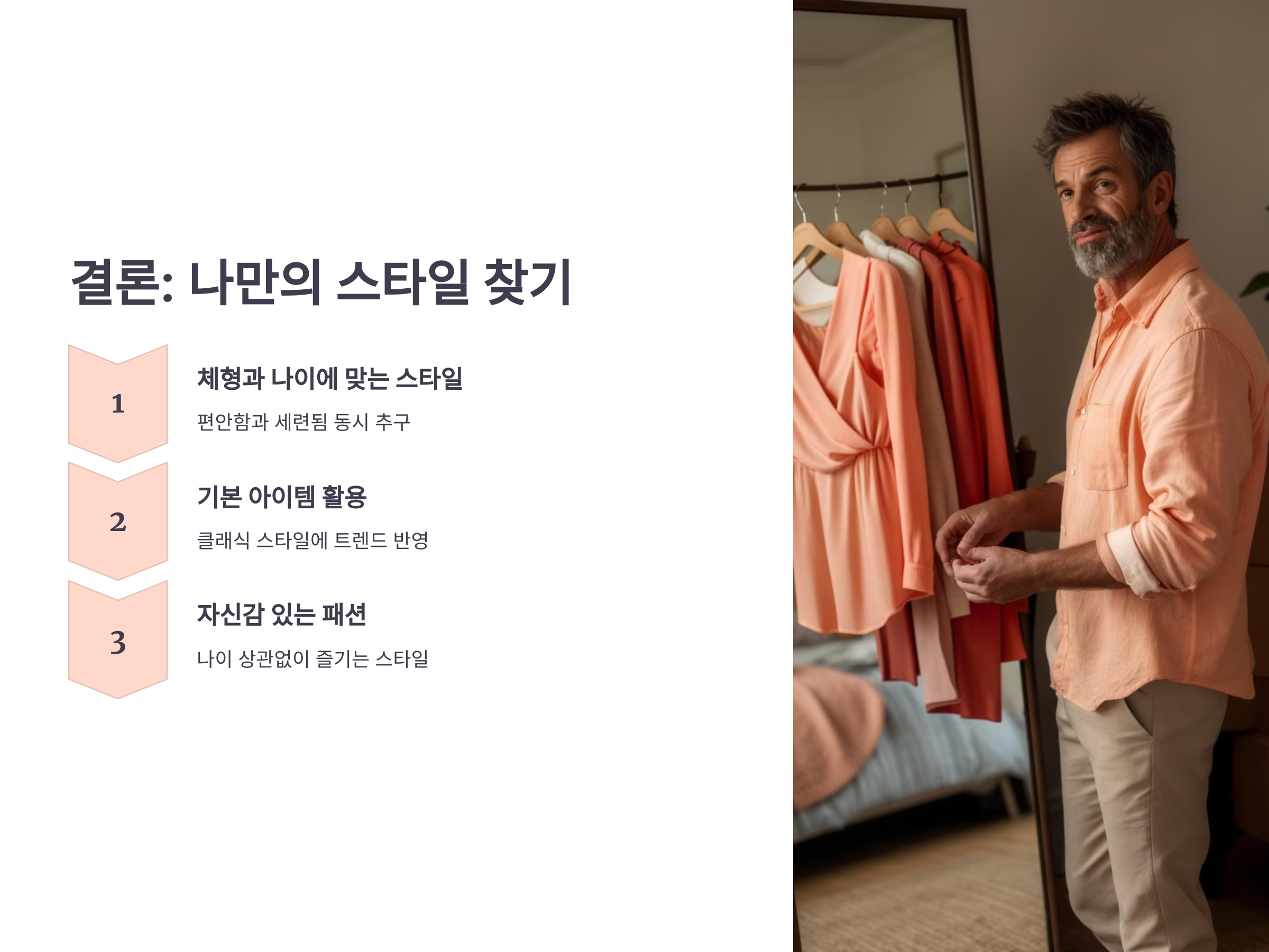 A: 나이에 맞는 자기 스타일을 찾는 것이 가장 중요합니다. 기본적인 아이템을 활용하고, 적절한 핏과 색상을 선택하는 것이 좋습니다. 너무 유행을 쫓기보다는 편안하고 세련된 스타일을 추구하세요.