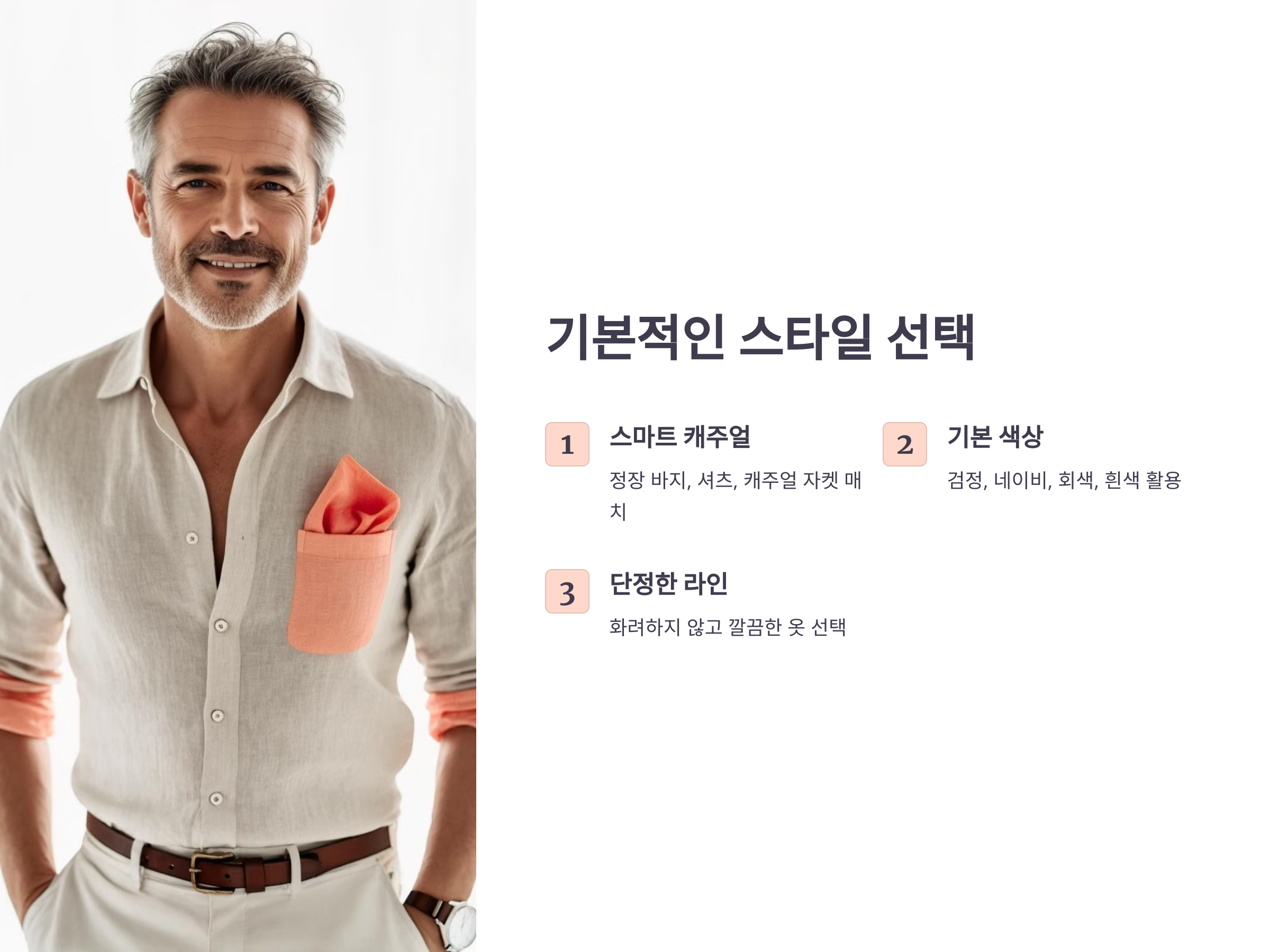 중장년층 남성들이 스타일을 선택할 때 중요한 점은 유행을 따라가되, 클래식한 아이템을 잃지 않는 것입니다. 트렌드에 맞는 옷을 선택하되, 너무 유행을 쫓는 것보다는 클래식한 디자인의 아이템을 활용해 나만의 스타일을 완성하는 것이 중요합니다.